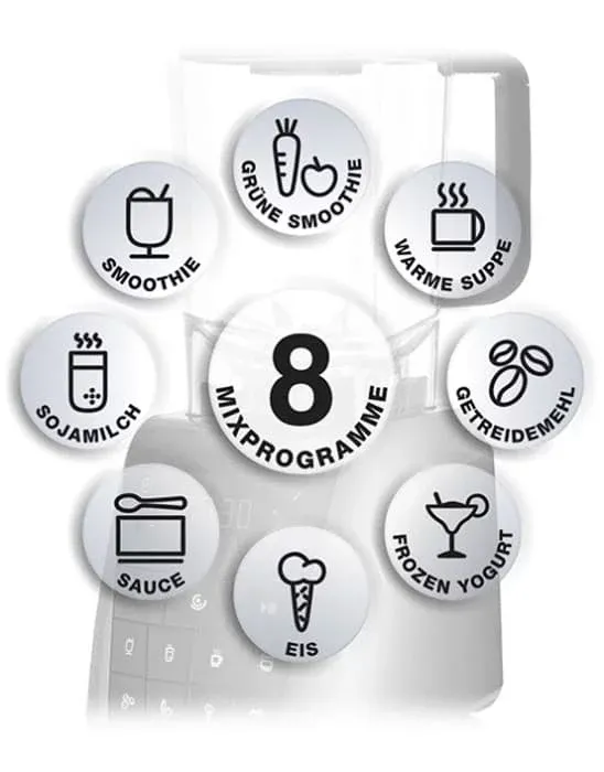 Tritan ist hitzebeständig, schlagfest und langlebig. Mit einem Fassungsvermögen von 1,5 Liter können mit dem Mixbehälter sowohl heiße als auch kalte Speisen zubereitet werden. Die patentierte Smart Corner Technologie sorgt dafür, dass das Mixgut sich optimal ohne Störungen durch den Behälter bewegen kann. Herkömmliche Behälter drücken das Mixgut gegen die Behälterwand. Durch den wellenförmige Behälterboden bewegt sich das Mixgut in Form einer dreidimensionalen 8 durch den Mixbehälter, so dass es immer wieder zu den rotierenden Edelstahlklingen gezogen wird. Dadurch wird das Mixgut schneller gemixt und verfügt über eine homogenere Konsistenz.