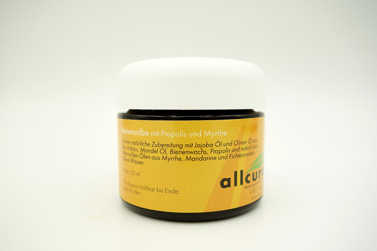 Bienensalbe mit Propolis, Myrrhe natürlichen Ölen und Bienenwachs, Pflege bei rissiger, schuppiger und trockener Haut, spröden Lippen, Hautreizungen, Schrunden, Hornhaut. Macht die Haut geschmeidig und widerstandsfähig.