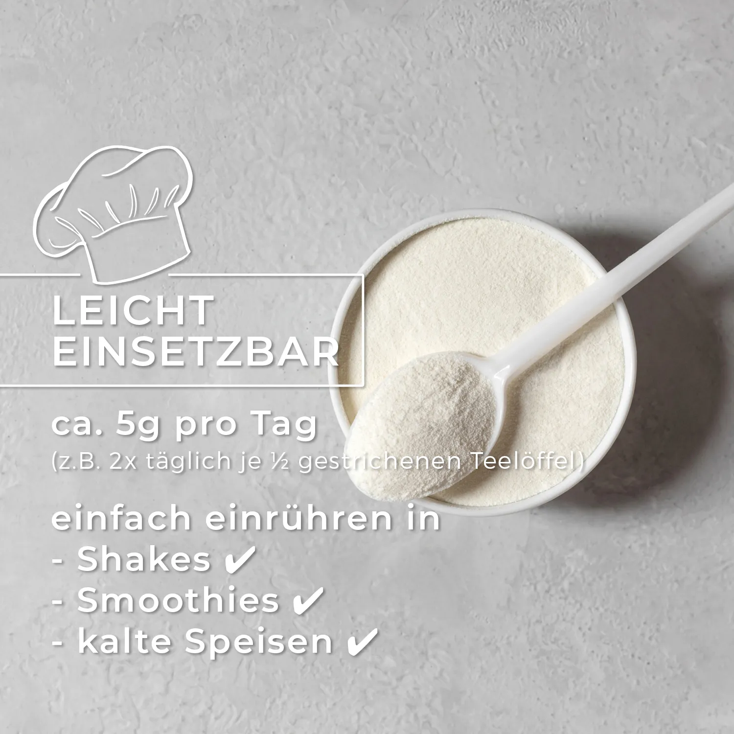 Mit einer Tagesdosis von bis zu 5 g Inulin Pulver können Sie Ihren täglichen Ballaststoffbedarf decken und von den positiven Effekten profitieren. Unser Inulin Pulver ist einfach zu verwenden und kann in eine Vielzahl von Lebensmitteln und Getränken integriert werden. Ob in Müsli, Joghurt, Smoothies, Shakes, Tees oder Backwaren – die Anwendungsmöglichkeiten sind vielfältig und individuell anpassbar.