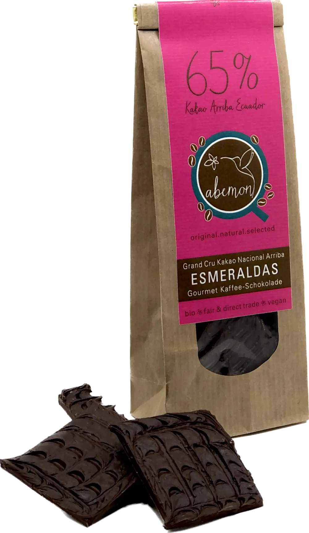 Basis dieser Kreation ist unsere Bio – Schokolade 65% Esmeraldas veredelt mit dem Single Origin Arabica-Kaffee aus Peru.