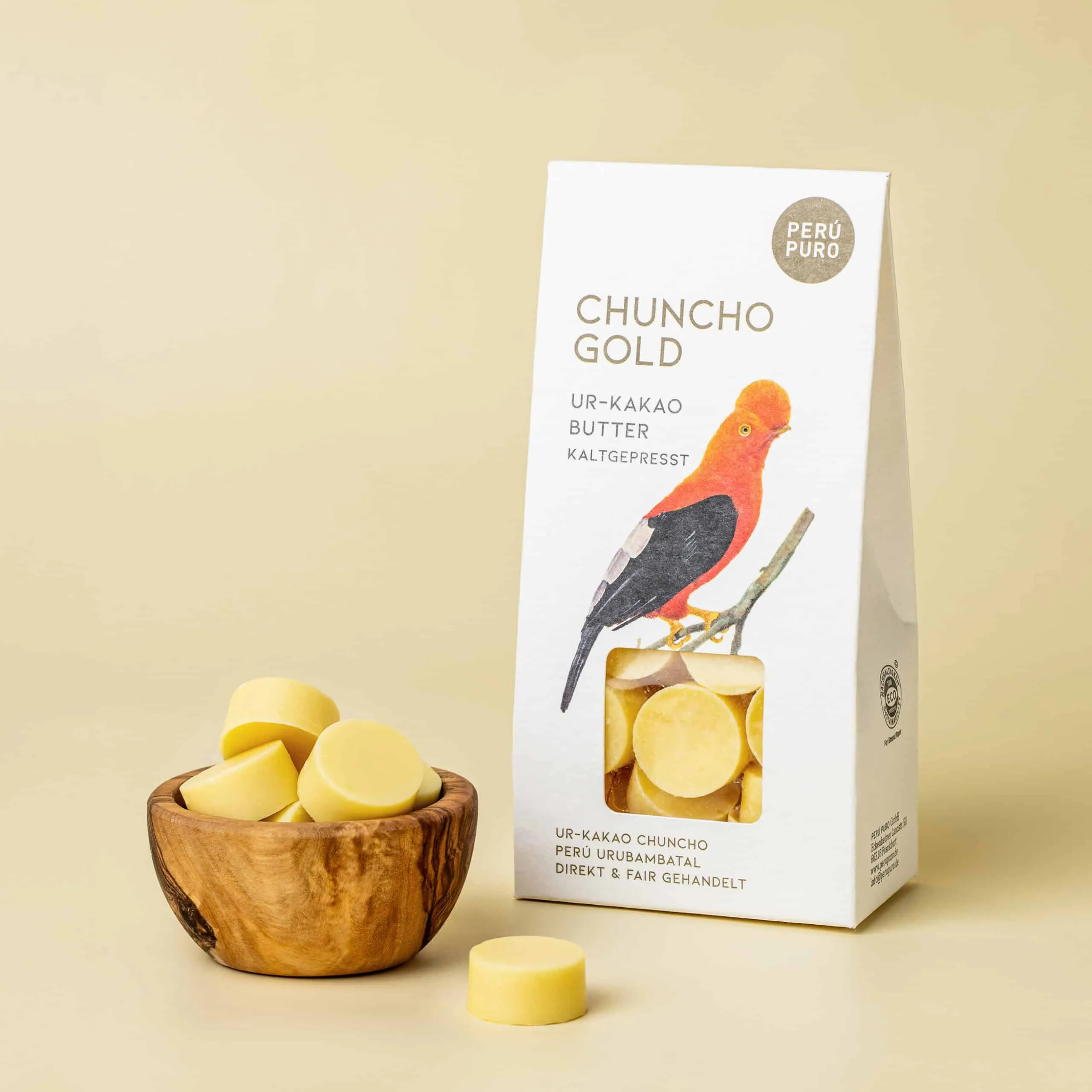 Der Pate unserer CHUNCHO GOLD Ur-Kakaobutter ist der Andenfelsenhahn (Rupicola peruvianus). Die Tiere wurden exlusiv für uns vom peruanischen Künstler Willian Mamani Loayza von Hand gezeichnet. Der edle Spitzbeutel aus unbeschichtetem Papier stammt aus der Büttenpapierfabrik Gmund am Tegernsee. Die Kakaoprodukte werden direkt in Peru hergestellt. Verpackt wird von Hand in der Lebenshilfe-Werkstatt für Menschen mit geistiger Behinderung in Nüdlingen.