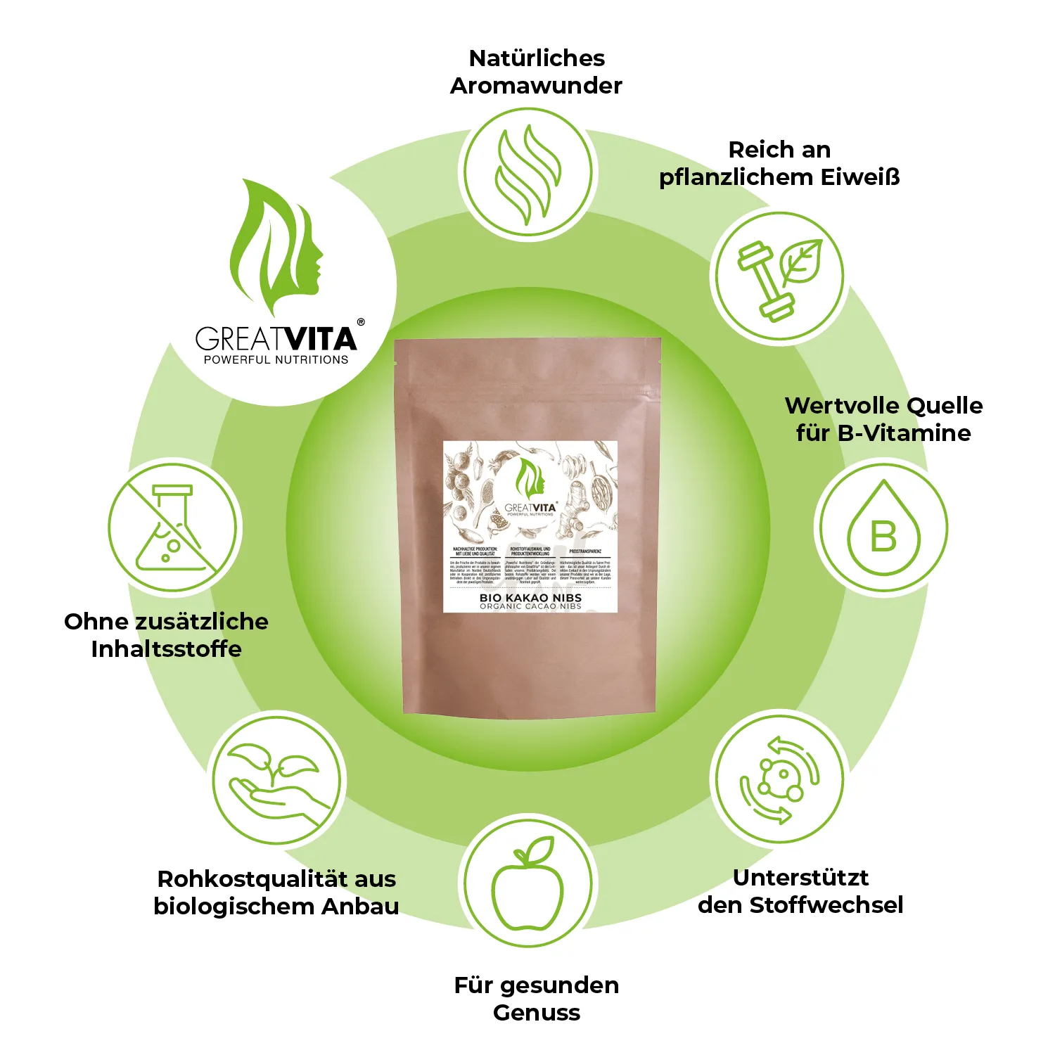 GreatVita Kakaonibs enthalten weder Zucker noch andere Zusatzstoffe. Reiner, biologisch angebauter Kakao enthält wichtige Ballaststoffe und hat eine fast schon berauschende Wirkung auf den Körper. Selbst die Mayas und Inkas hielten Kakaozeremonien, um das Ungleichgewicht zwischen Mensch und Natur zu bereinigen. Es soll Gefühle lösen und die Intuition stärken.