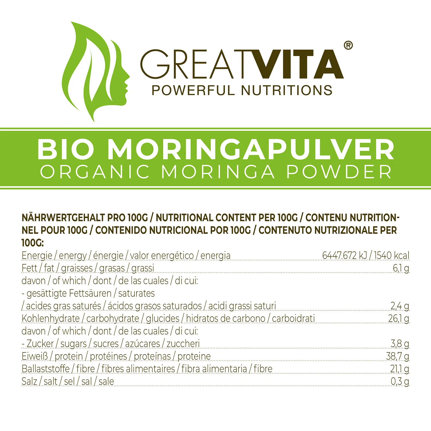 • HOCHWERTIG UND REIN. GreatVita Moringa Pulver zu 100% rein Pflanzlich und frei von Farb- und Süßstoffen, künstlichen Aromen und anderen Chemikalien.