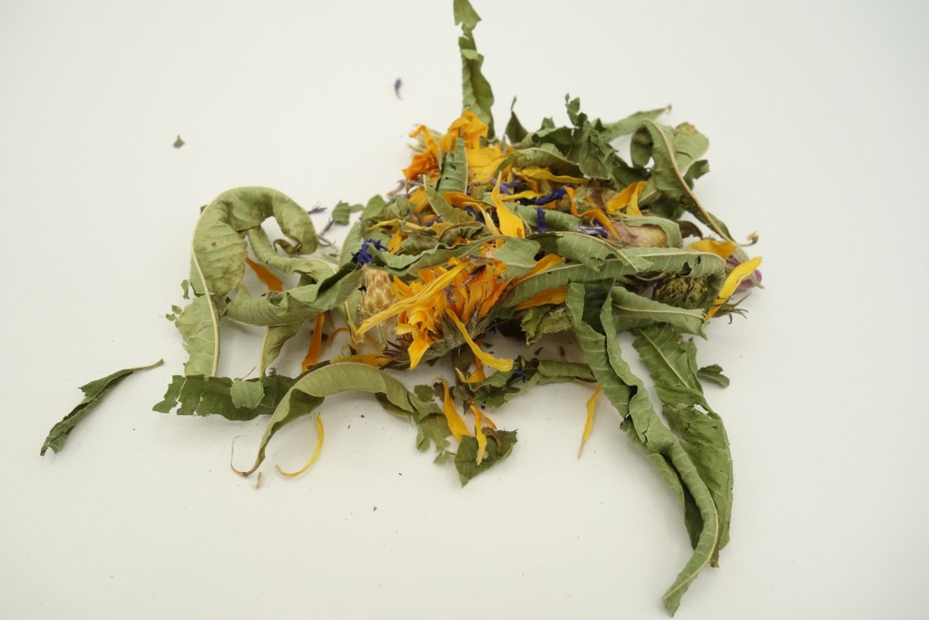 Zutaten: Ringelblumenblüten*, Kornblumenblüten*, Rosenblüten*, Verbenablätter* (47 %).