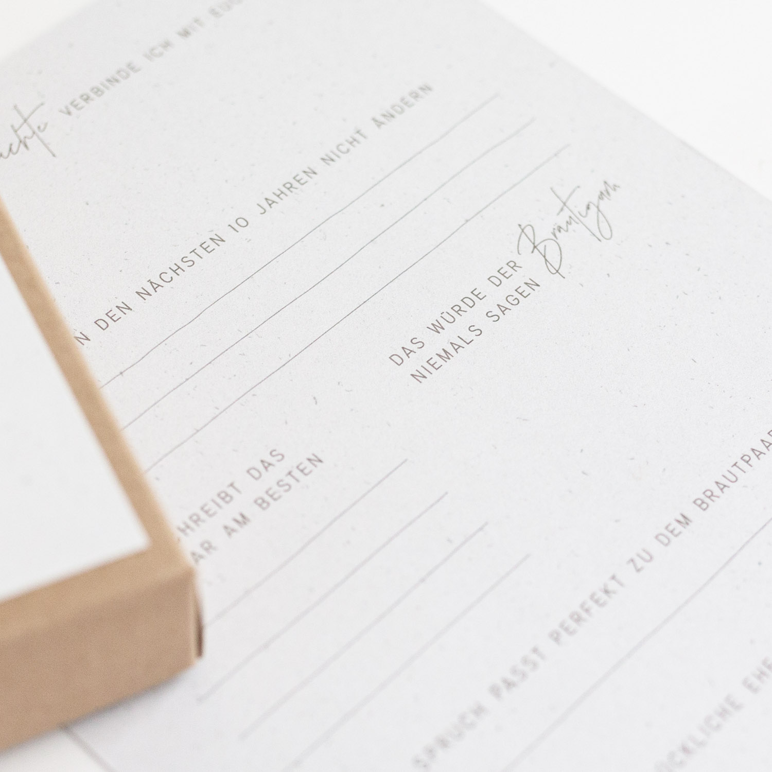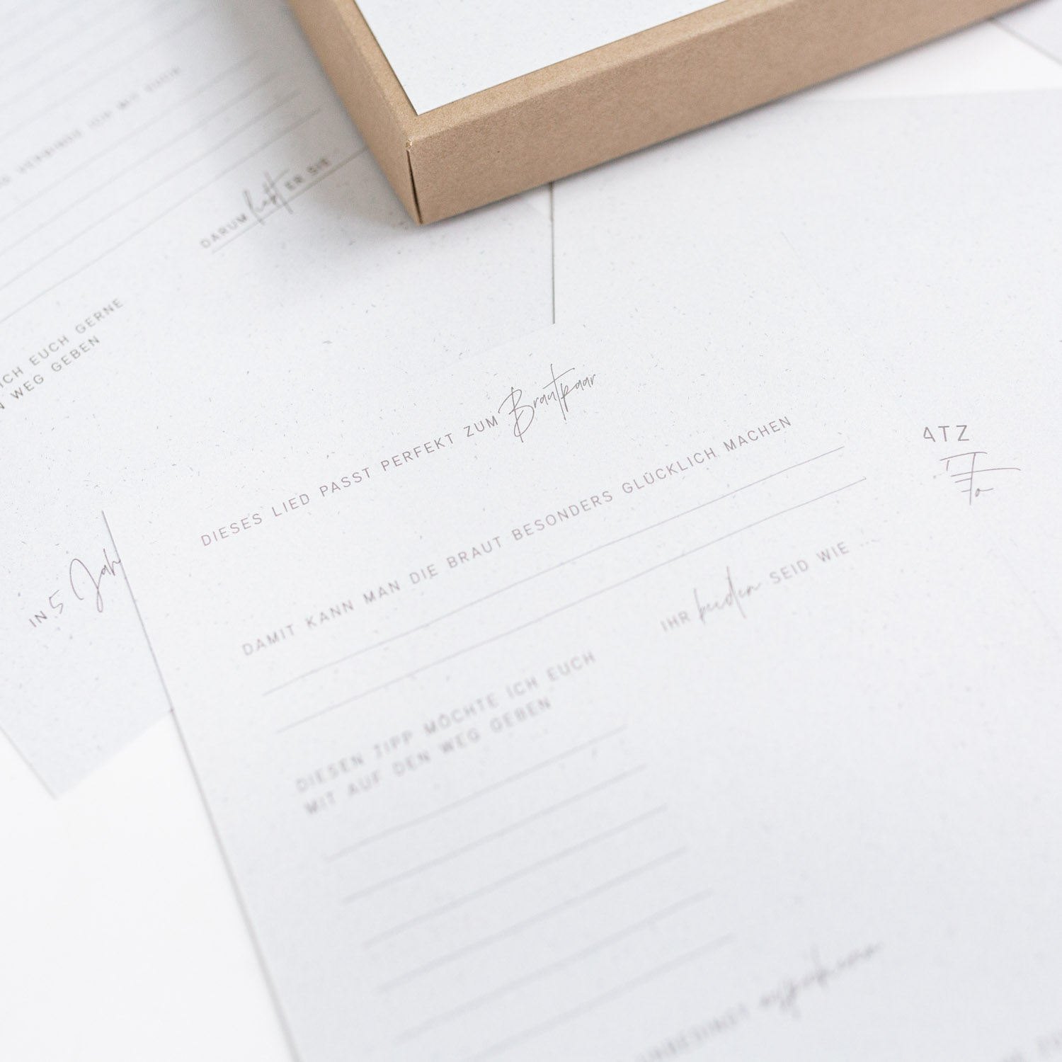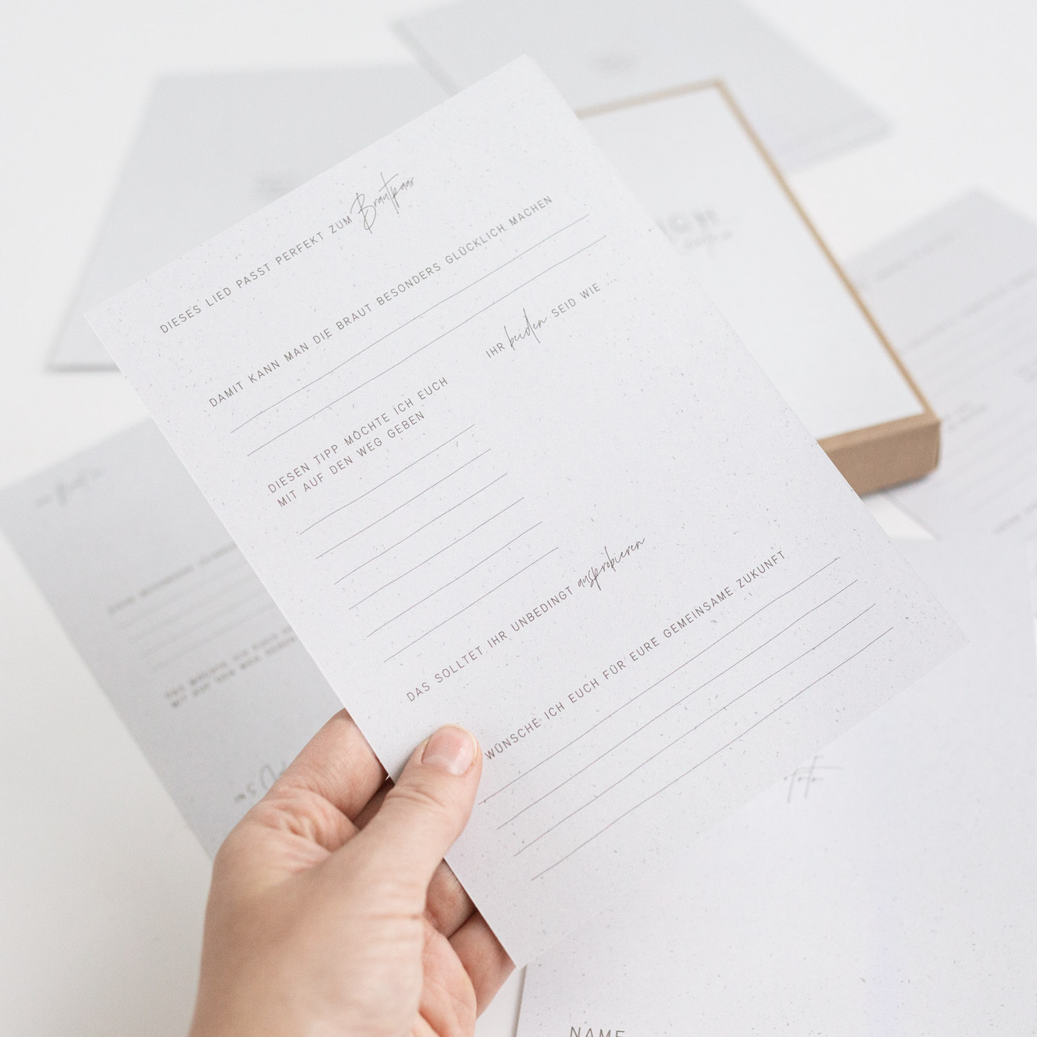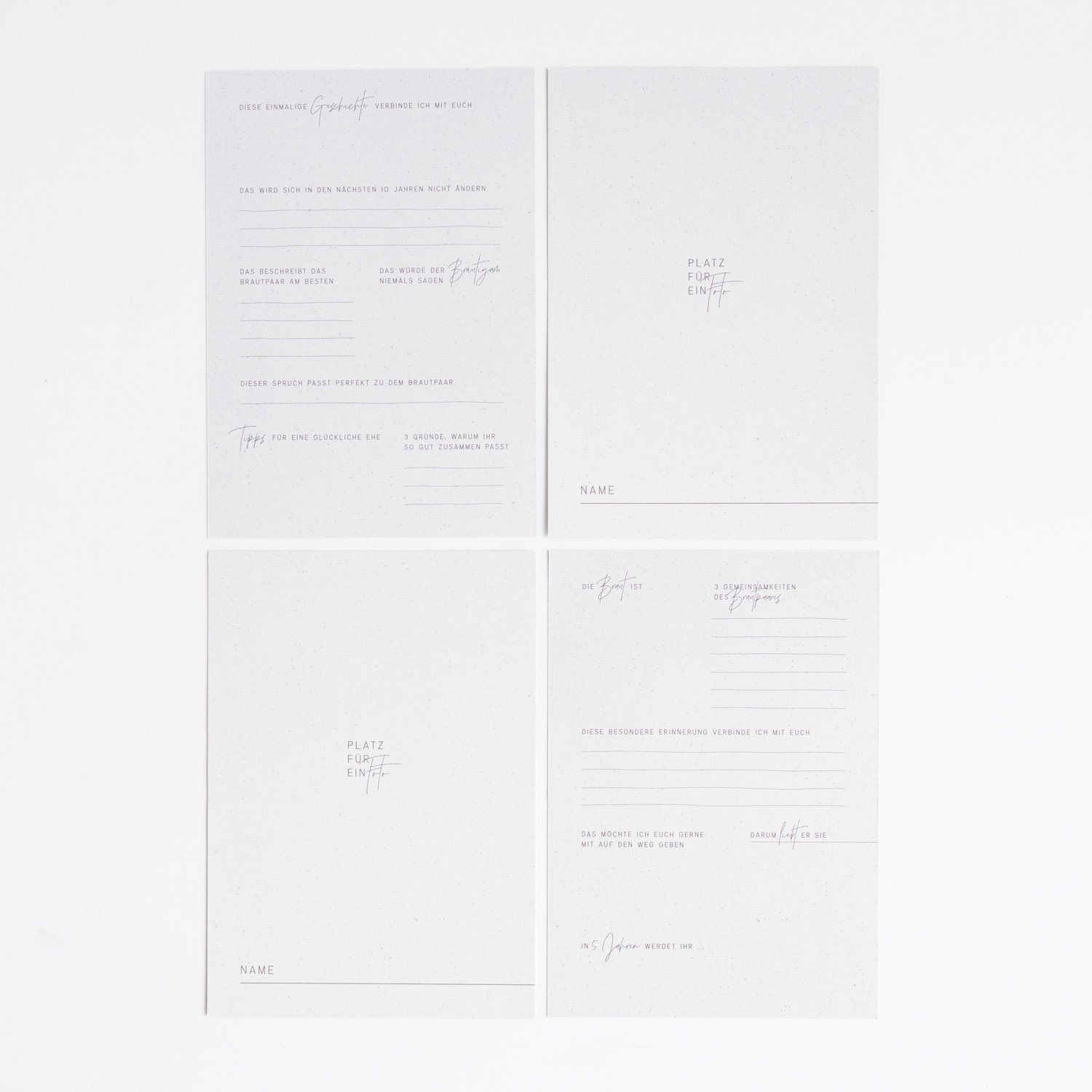 Insgesamt gibt es 4 verschiedenen Karten mit unterschiedlichen Fragen! Und ein weiterer Vorteil soll nicht unerwähnt bleiben: Die Gästebuchkarten können gleichzeitig an alle eure Gäste vergeben und somit ausgefüllt werden! So sollte es jeder schaffen sich an eurem großen Tag zu verewigen!