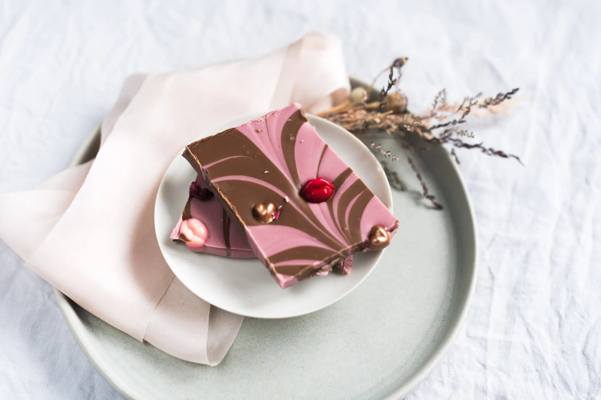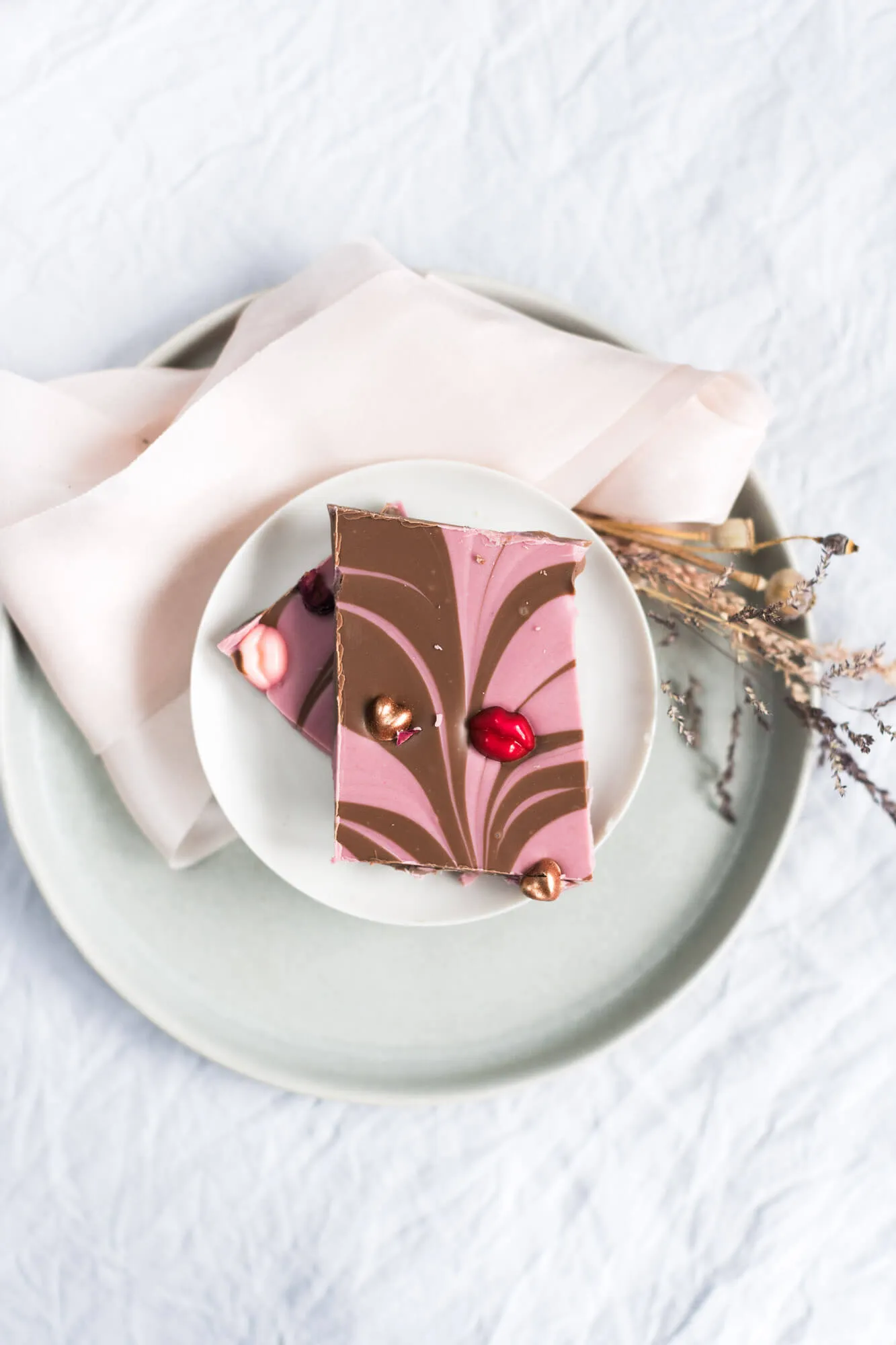 Mit Beeren verfeinerte weiße Schokolade verschmilzt mit Milchschokolade. Getoppt wird diese ultra leckere Kombi mit Kussmündern in rot und rosa und Bronze Herzen. Dazwischen getrocknete Rosenblätter.