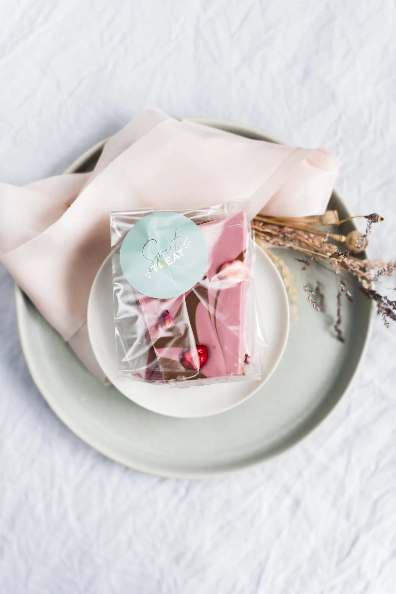 ca. 100g in einem transparenten Beutel mit goldfoliertem Etikett ‘Sweet Treat’