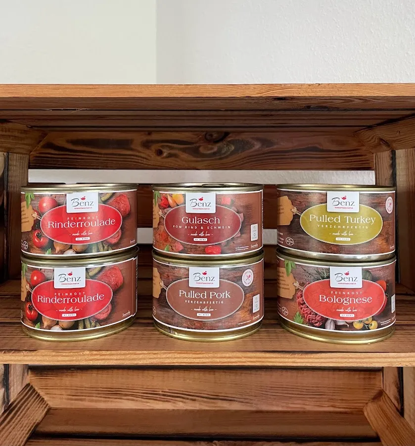 1 Dose Pulled Pork, 1 Dose gemischtes Gulasch, 2 Dosen Rinderrouladen, 1 Dose Pulled Turkey, 1 Dose Bolognese