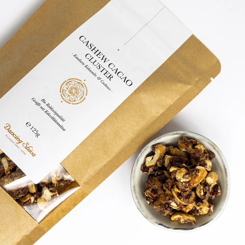Unser Cashew Cacao Cluster ist ein köstlicher Snack aus cremigen Cashews, knackigen Roh-Kakaonibs, karamelligem Kokosblütennektar und einer Prise Meersalz. Einfach umwerfend lecker!
