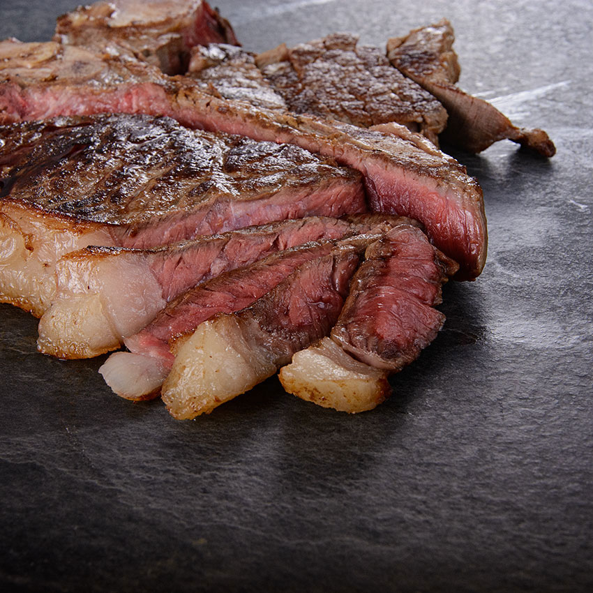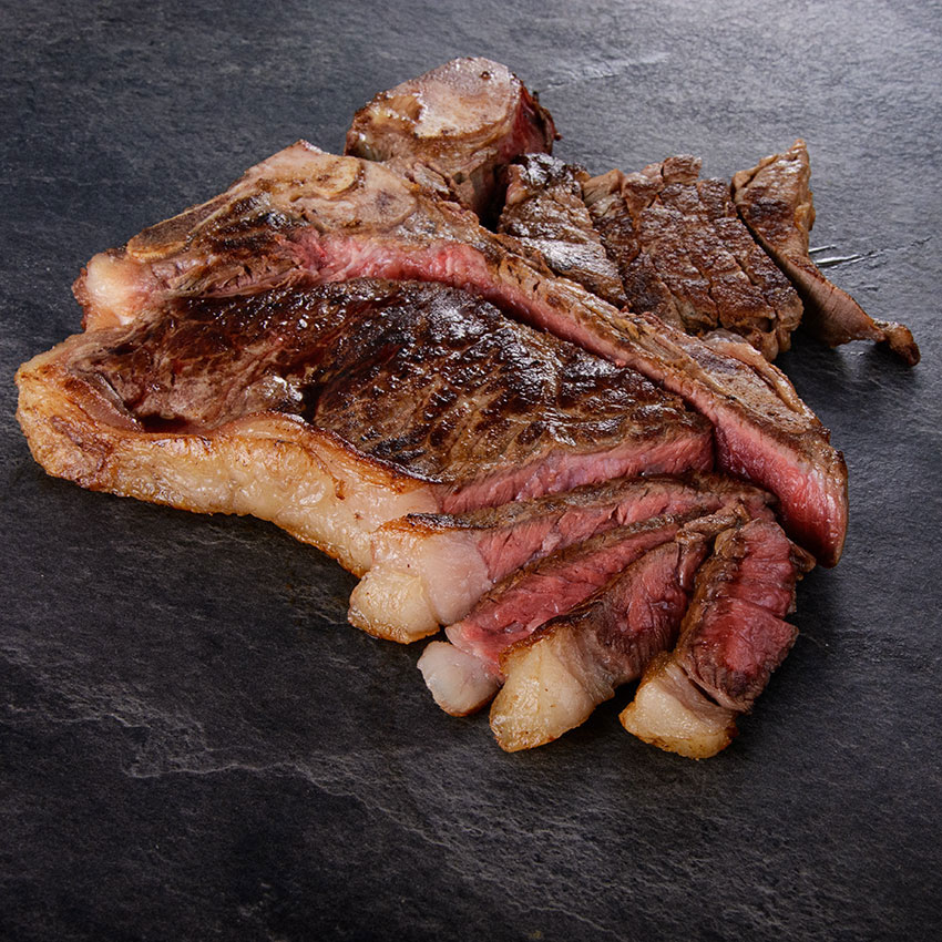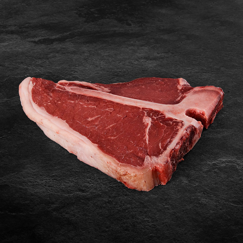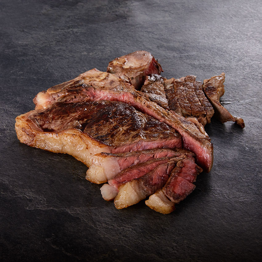 Das T-Bone Steak oder auch Bistecca alla fiorentina aus Italien beinhaltet 2 (!) verschiedene Fleischteile in einem Steak. Das kleinere Fleischstück seitlich des T-Knochens ist das zarte Filet (Lungenbraten). Der größere Fleischteil auf der anderen Knochenseite das kräftige Roastbeef (Beiried). Ideal für Feinschmecker, die Abwechslung lieben! Das T-Bone Steak ist ein absolut eindrucksvoller Steak Cut, der neben dem aromatischen Geschmack auch als optisches Steak Highlight genossen wird und einen bleibenden Eindruck hinterlässt. Der Steak Klassiker ist superzart und leicht im Biss und besticht durch die beiden Fleischsorten Filet und Roastbeef – getrennt durch den markanten T-Knochen. Dieser Knochen fördert das ganz besondere und unverwechselbare Fleischaroma dieses T-Bone Steaks.