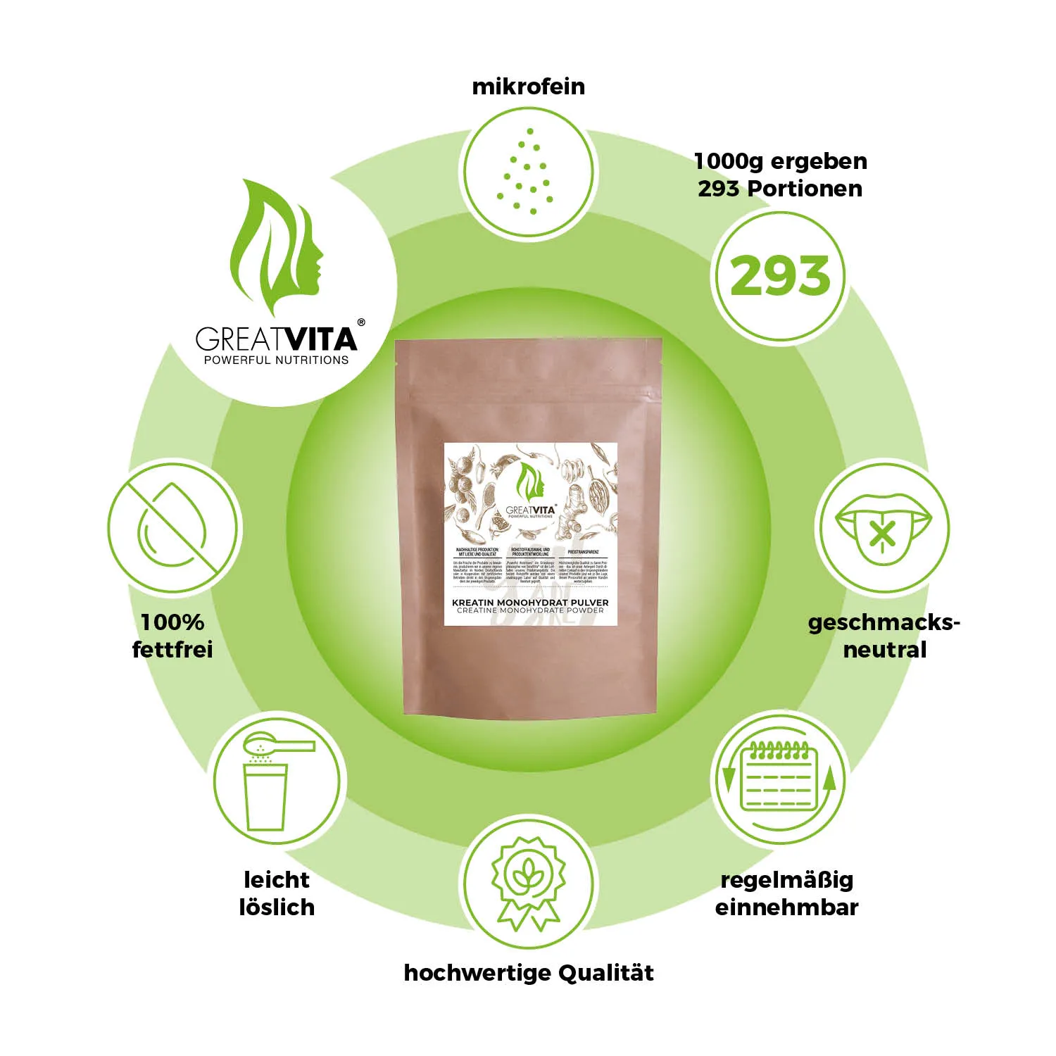 • 𝗣𝗿𝗲𝗺𝗶𝘂𝗺 𝗤𝘂𝗮𝗹𝗶𝘁ä𝘁: Unser Kreatin Monohydrate bietet 1000g reines Kreatin, mikrofein und sehr gut löslich. Ideal für den täglichen Gebrauch mit 293 Portionen pro Beutel.