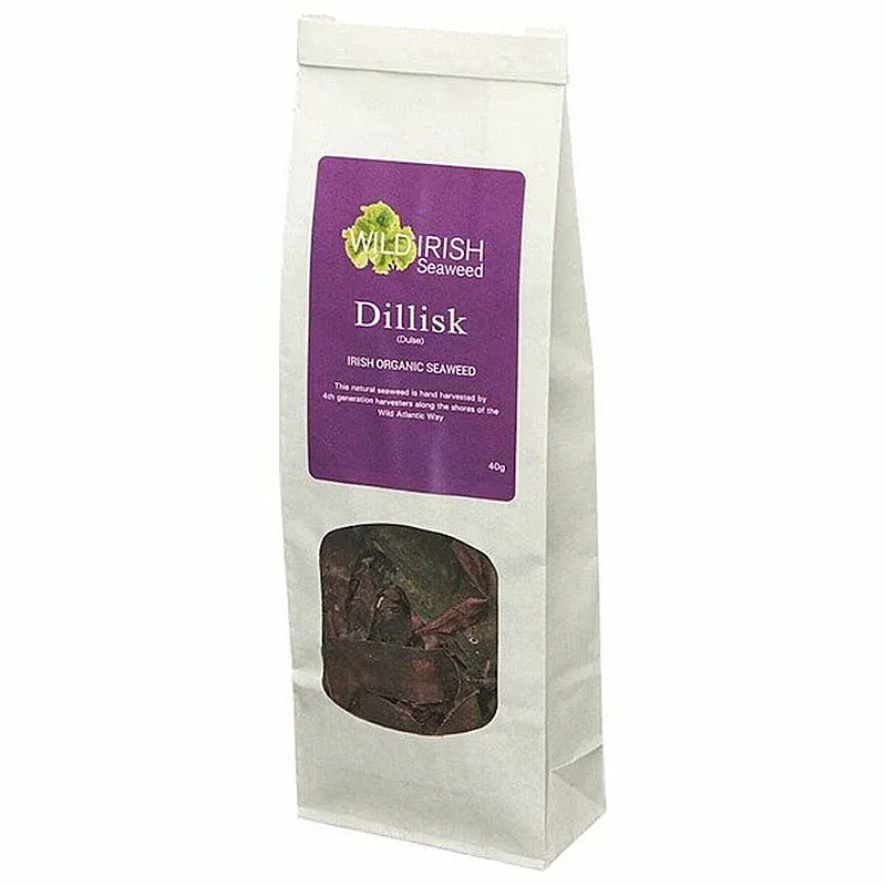 Die Dulse Alge wird normalerweise nur von Juni bis September geerntet, alle Schalen und kleinen Partikel werden abgewaschen, und dann wird die Dulse getrocknet und ist somit verkaufsfertig. Der leicht salzige Geschmack des Meeresgemüses macht es zu einem perfekt gesunden Salzersatz. Wildes irisches Seegras wird seit über 100 Jahren in Westirland geerntet. Alle Algen stammen aus den unberührten, nährstoffreichen Gewässern des Atlantischen Ozeans. Algen enthalten fast alle Mineralien, die der Mensch benötigt, einschließlich Kalzium, Natrium, Magnesium, Kalium, Jod, Eisen, Zink und viele Spurenelemente. Es enthält auch Vitamine wie Vitamin A (in Form von Beta-Carotin), B1, B2, B6, Niacin, Vitamin C, Pantothensäure, Folsäure und Spuren von Vitamin B12.