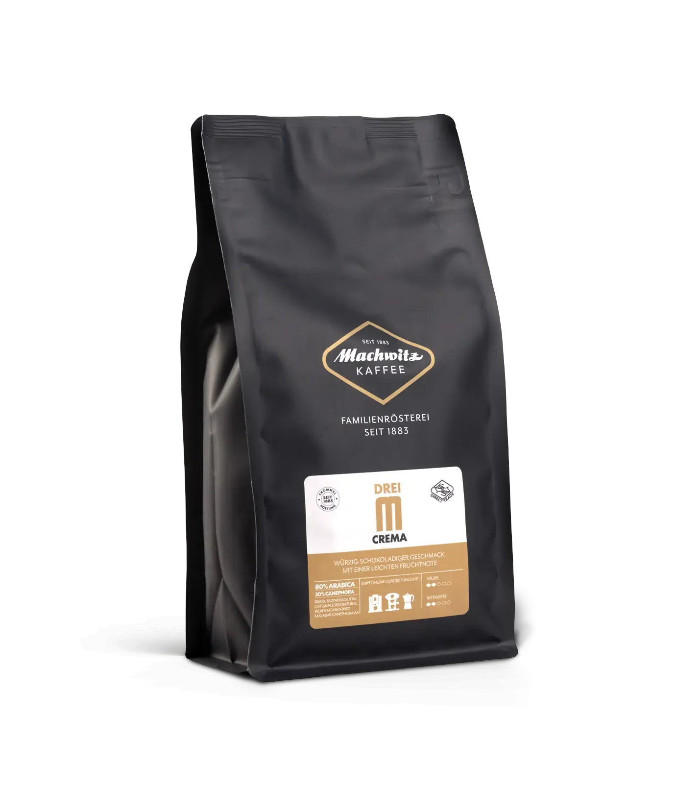 Der Drei M Crema ist ein Blend aus 80% Arabica und 20% Robusta. Der Kaffee wird bei 208 °C, ca. 14 Minuten geröstet. Durch die mittlere Rösstiefe ist der Kaffee würzig-schokoladig im Geschmack mit einer leichten Fruchtnote und hat wenig Säure. Der Arabica, Varietät Catuai, pulped natural, beziehen wir als DIRECT Trade von der Plantage Fazendas Dutra, aus Brasilien. Die Farm wird von den Brüdern Ednilson und Walter Dutra geleitet und ist wie unsere Rösterei, ein Familienbetrieb mit langer Tradition. Der Robusta ist ein India Malabar Monsooned Robusta AA.