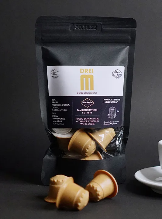 Der Drei M Espresso ist ein Blend aus 80% Arbica und 20% Robusta. Durch die dunkle Rösttiefe ist der Kaffee würzig-schokoladig im Geschmack und hat sehr wenig Säure. Der Arabica, Varietät Catuai, pulped natural, beziehen wir als DIRECT Trade von der Plantage Fazendas Dutra, aus Brasilien. Die Farm wird von den Brüdern Ednilson und Walter Dutra geleitet und ist wie unsere Rösterei, ein Familienbetrieb mit langer Tradition. Der Robusta ist ein India Malabar Monsooned Robusta AA.