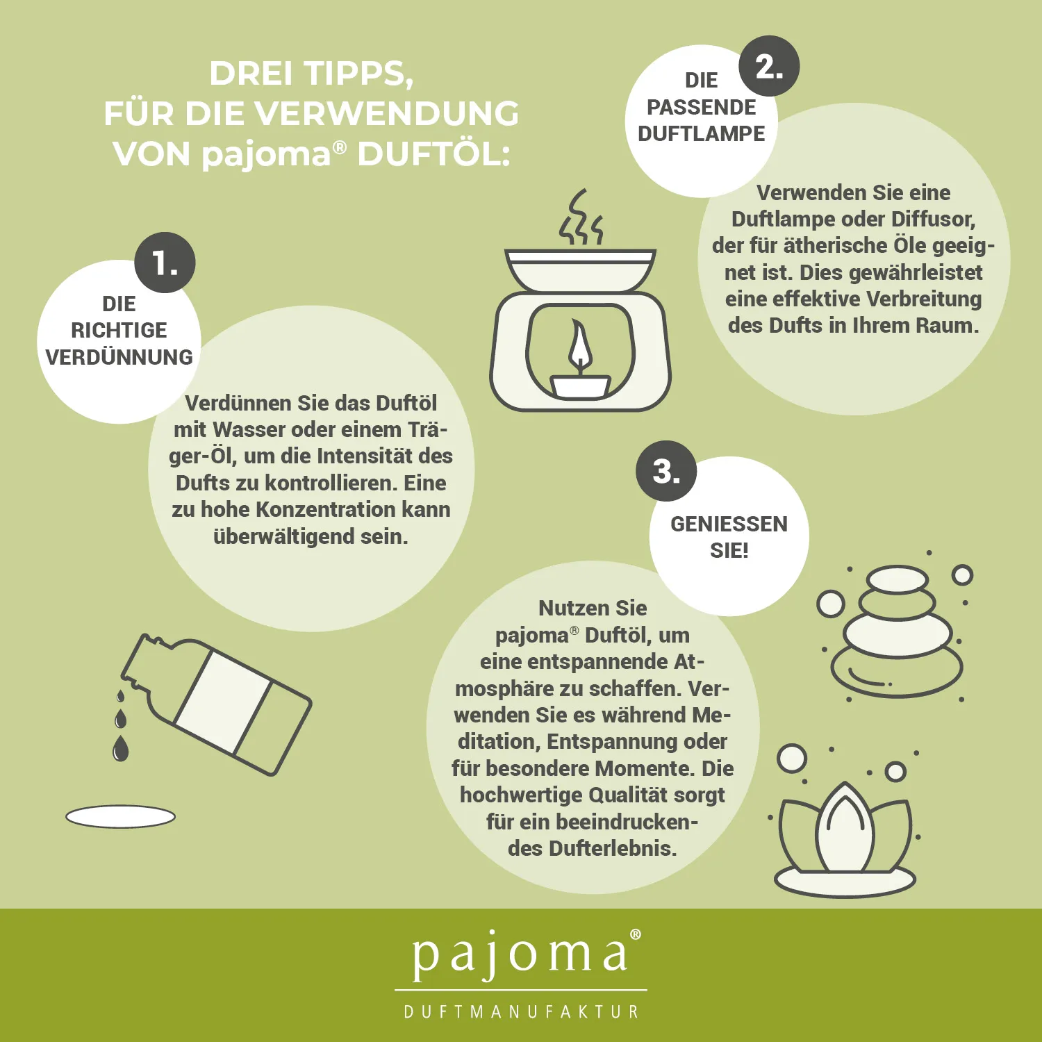 Geben Sie einfach einige Tropfen in eine Duftlampe oder in das Wasser eines Diffusers, um Ihren Raum mit einem herrlichen, intensiven Duft zu erfüllen. Die hochkonzentrierte Formel sorgt dafür, dass bereits wenige Tropfen ausreichen, um eine angenehme Atmosphäre zu schaffen.