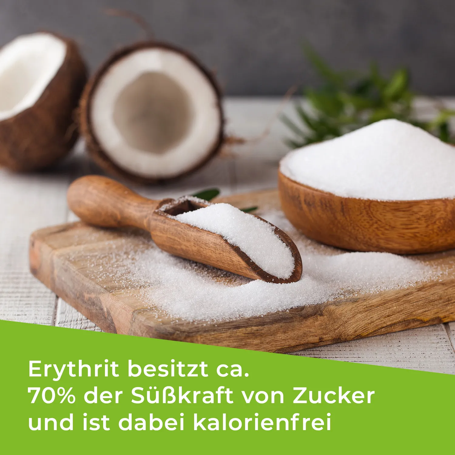 Unser Erythrit ist kalorienfrei, schmeckt nahezu wie herkömmlicher Haushaltszucker, ist sehr gut löslich und liefert keine verwertbaren Kohlenhydrate.