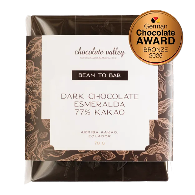 Kakaobohnen von der Esmeralda Küste in Ecuador stecken in dieser 77%igen Schokolade. Fruchtig, floral, leichte Säure und ausgewogener Kakaogeschmack.