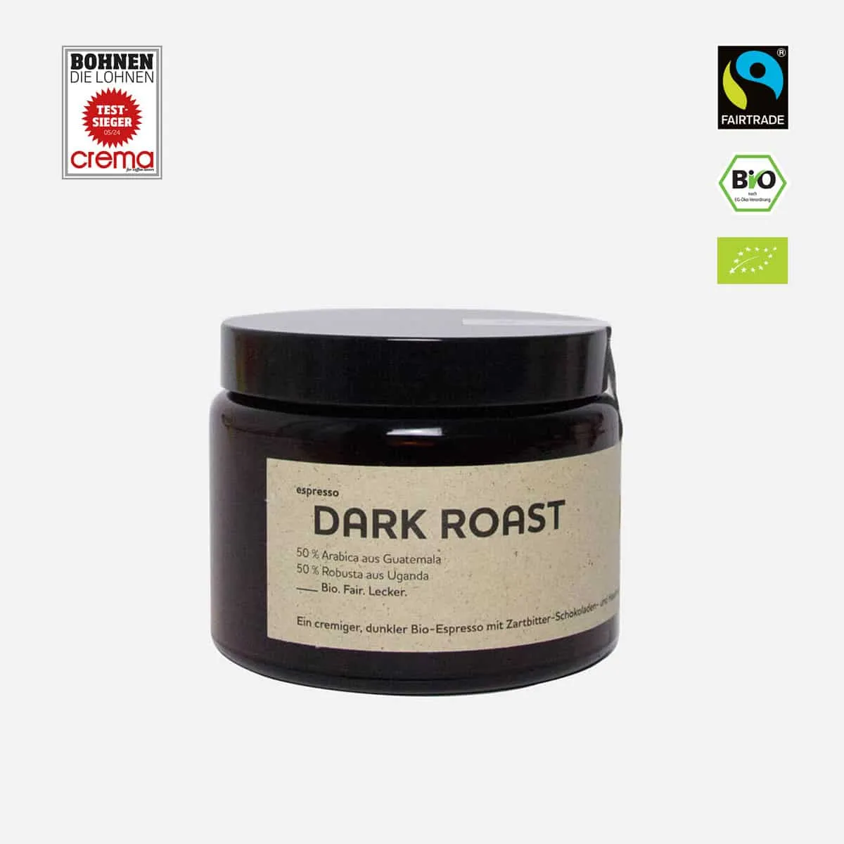 | Ausgezeichnet mit Platz 1 | Unser Espresso Dark Roast wurde in der renommierten Kaffee-Spezialistenzeitschrift Crema mit Platz 1 in der Rubrik „Bohnen, die lohnen“ ausgezeichnet. Diese Ehrung bestätigt die außergewöhnliche Qualität und den unverwechselbaren Geschmack unseres Espressos – ein Genuss, der überzeugt. |