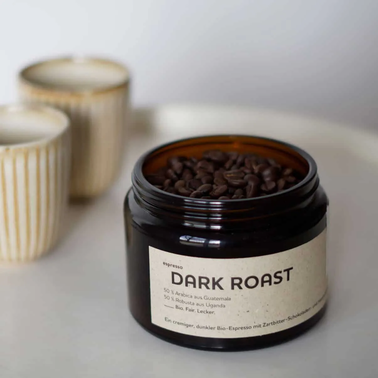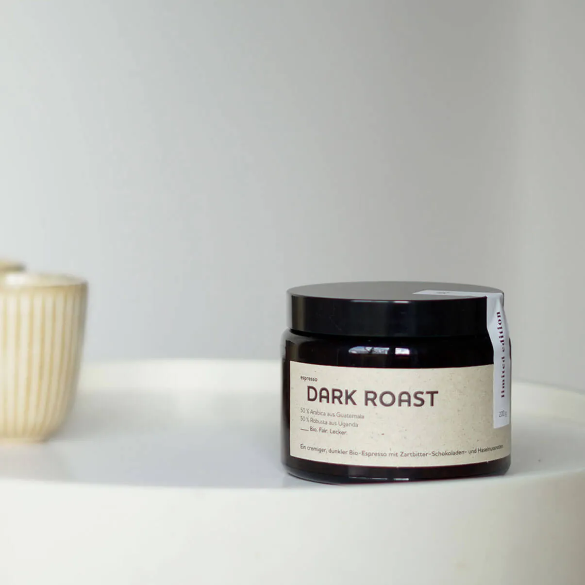 | Geschenkidee für Kaffeeliebhaber | Unser Dark Roast im Apothekerglas ist die ideale Geschenkidee für Freund*innen des traditionellen Espresso-Geschmacks. Ein hochwertiges Präsent, das in Erinnerung bleibt. |