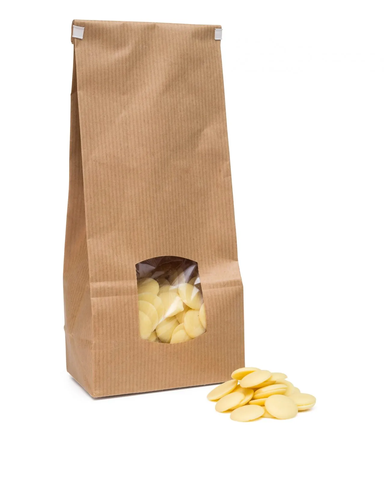 500g verpackt in einem Kraftpapier-Beutel mit Fettschutzbeschichtung innen und transparentem Fenster an der Vorderseite.