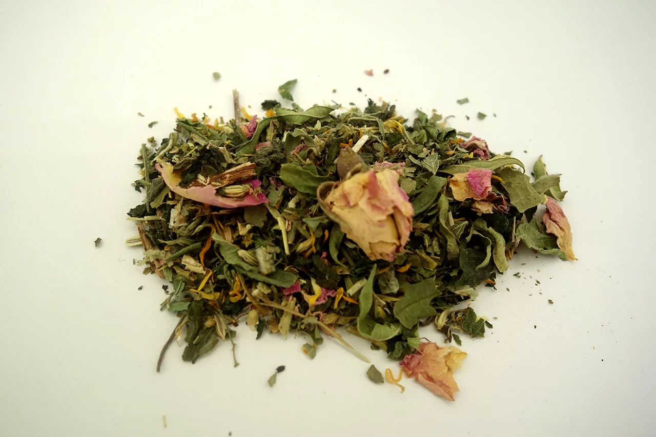 Kräutertee für Frauen. 1 Teel. pro Tasse, 5-8 Min. ziehen lassen. Alle Zutaten aus kontrolliert biologischem Anbau: Zitronenmelisse (Volksname=Frauenwohl), Frauenmantel, Schafgarbe, Passionsblume, Brennnessel, Fenchel, Zitronenverbena, Ringelblume, Rosenblüten.