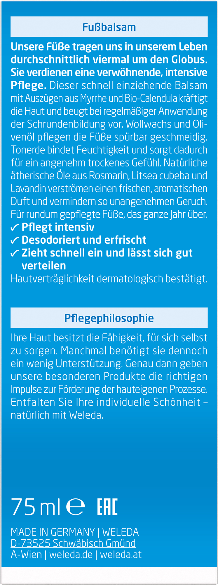 Produktbeschreibung: Der Weleda Fußbalsam pflegt mit stärkendem Myrrhe-Extrakt und hautberuhigendem Calendula-Extrakt Ihre Füße. Er zieht schnell ein und macht Sie bei regelmäßiger Anwendung widerstandsfähiger gegen Hornhaut- und Blasenbildung. Olivenöl und Wollwachs pflegen die Haut geschmeidig. Desodoriert, kühlt und bindet durch Tonerde Feuchtigkeit.