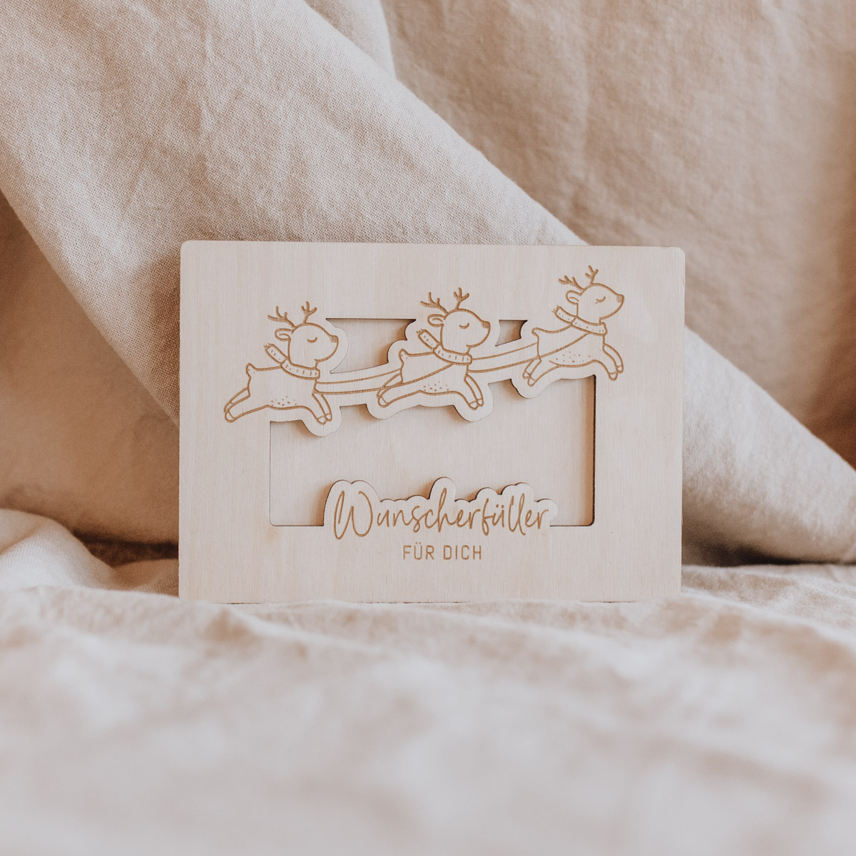 Karte aus Holz | Geld zum Einschieben | Motiv Rentiere | Spruch “Wunscherfüller für dich” | Format A6 | lasergraviert | ohne Geld & Dekoration