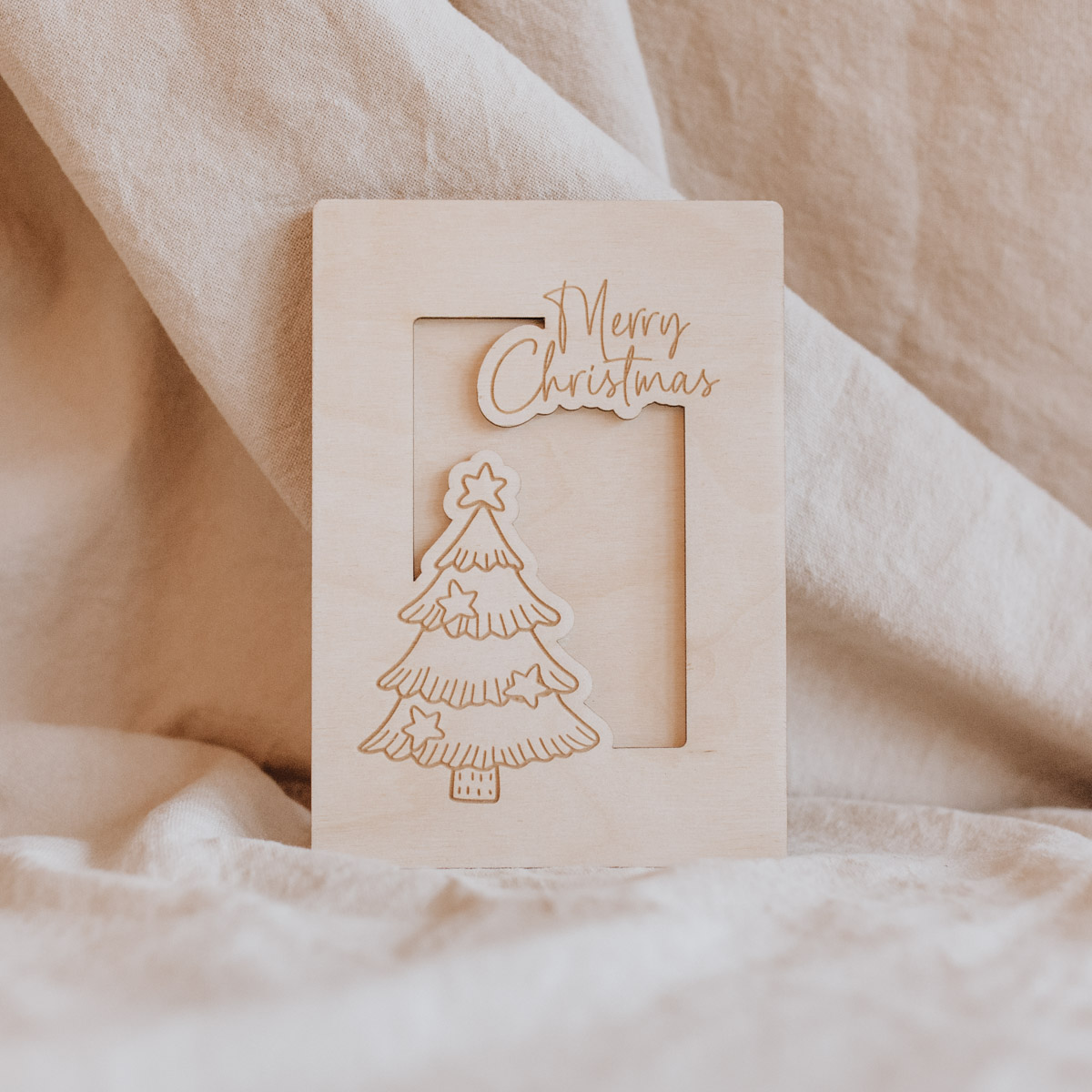 Auf der Karte ist ein Tannenbaum & der Spruch “Merry Christmas” eingraviert.