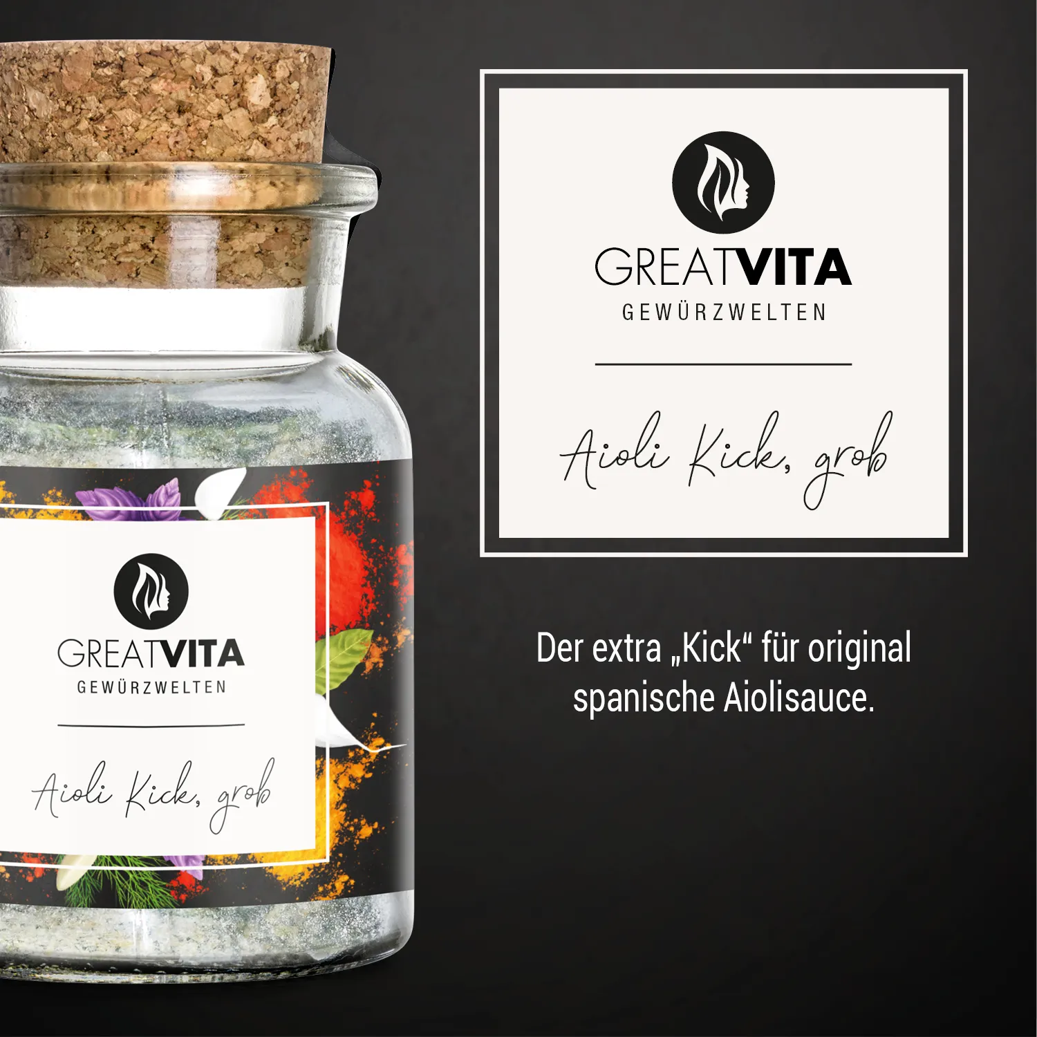Du magst es gern aromatisch und würzig? Dann hast Du mit unserer Aioli Gewürzzubereitung die richtige Basis für verschiedene Dips gefunden. Unsere grobe Aioli Gewürzzubereitung lässt die einzelnen Zutaten noch erahnen und auf ein großes Geschmackserlebnis hoffen, denn mit Knoblauch, Meersalz, Zwiebelgranulat, Petersilie und Dill steht Dir dieses bevor.