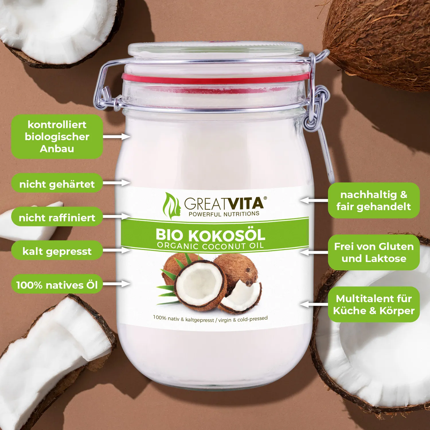 Schreibe die erste Bewertung für „GreatVita Bio Kokosöl, nativ, 3er Pack (3 x 1000 ml) im Bügelglas“