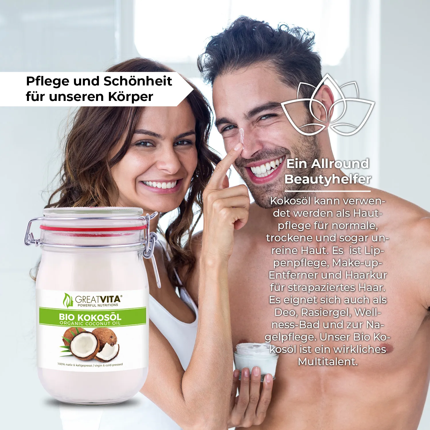 • Unser Bio Kokosöl perfekt für Anwendungen in der Haut- und Haarpflege geeignet