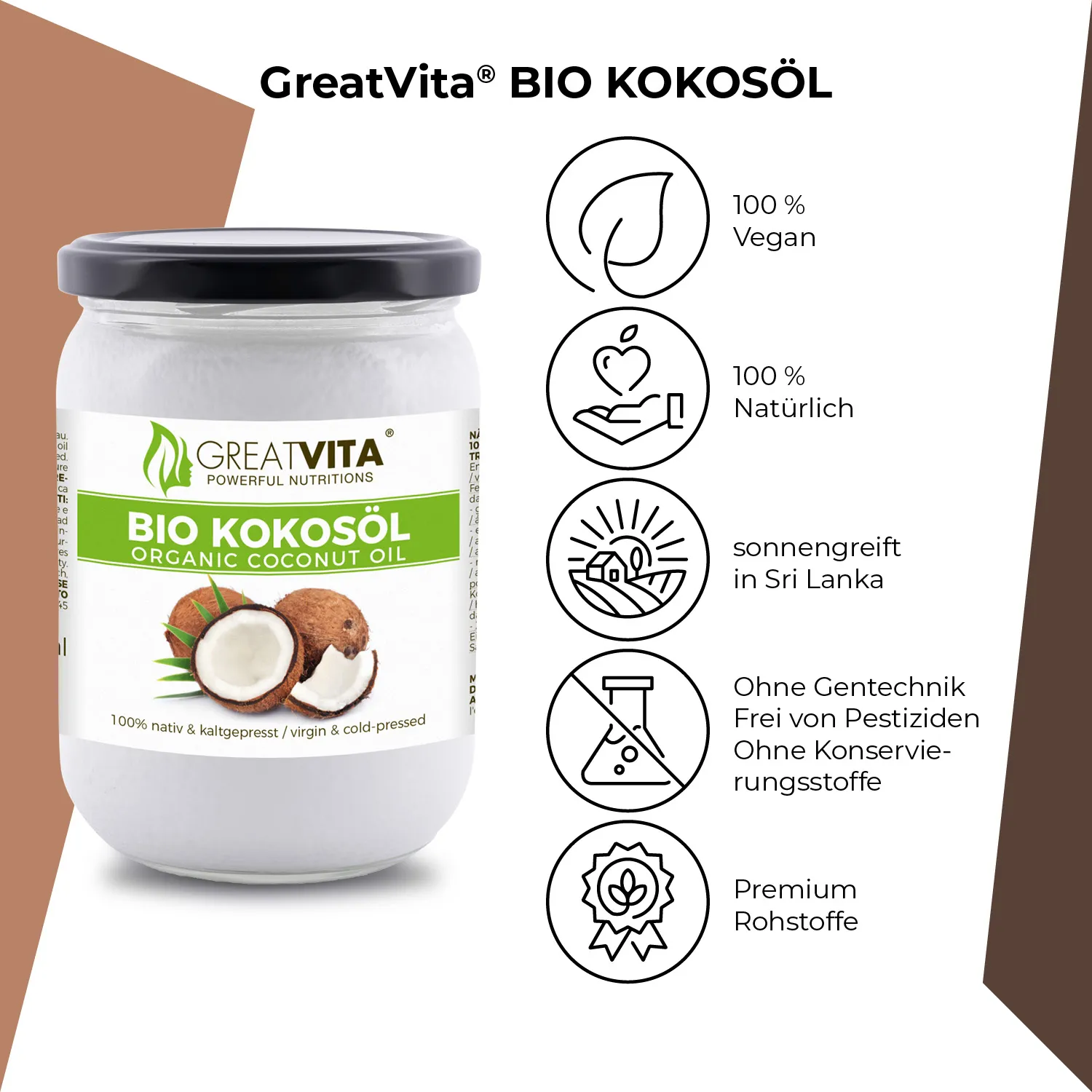 GreatVita Bio Kokosöl, nativ, 500 ml im Glas zum Kochen & Backen, Hautpflege Kokosnussöl