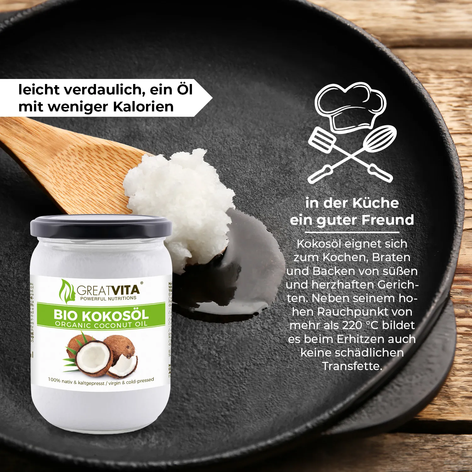• Bio Kokosöl ist auch bestens geeignet zum Kochen, Braten und Backen geeignet