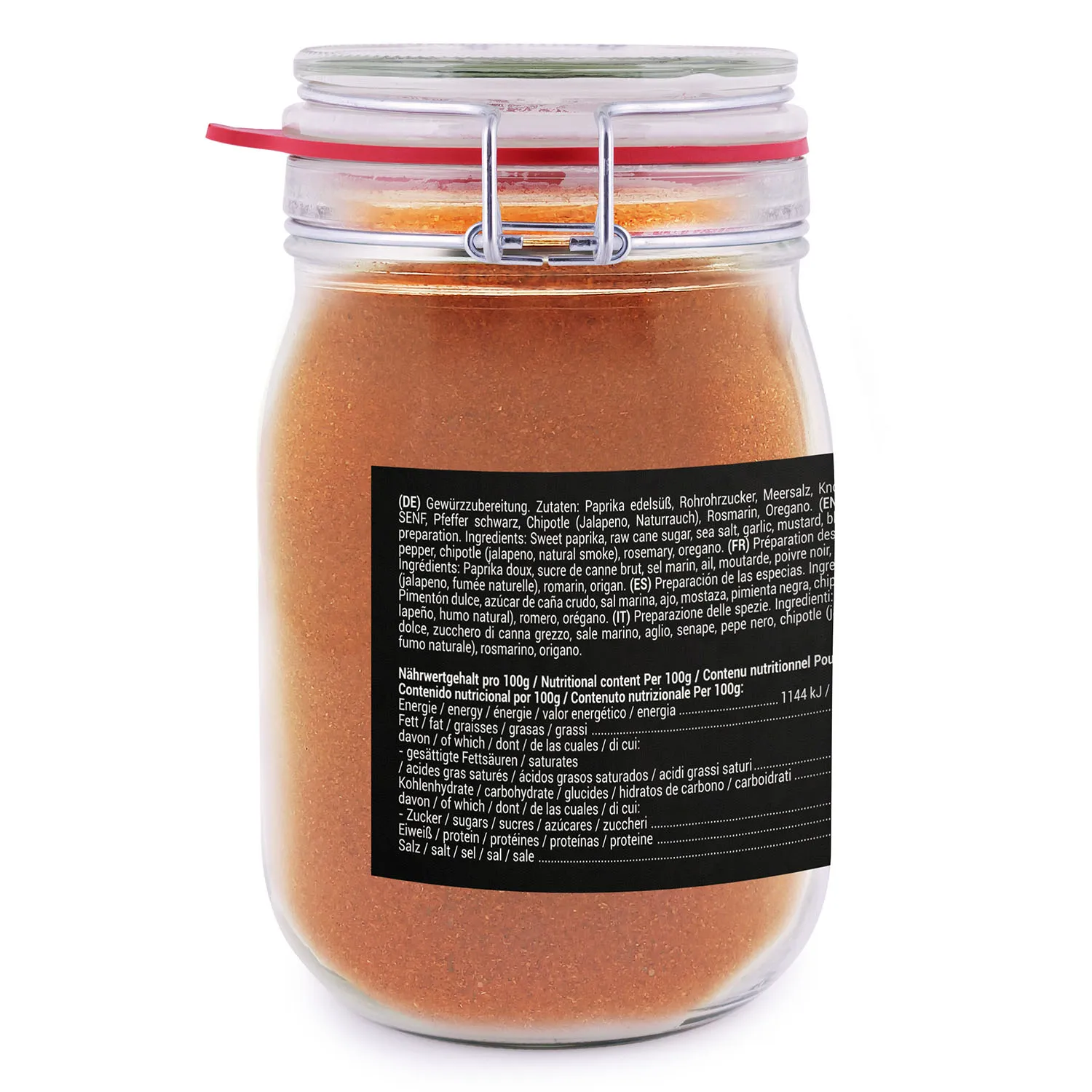 Zutaten: Paprika, Meersalz, Zucker, Knoblauch, Chili-Cayennepfeffer, Kreuzkümmel, Pfeffer, Senfmehl. (Kann Spuren von Senf & Sellerie enthalten)