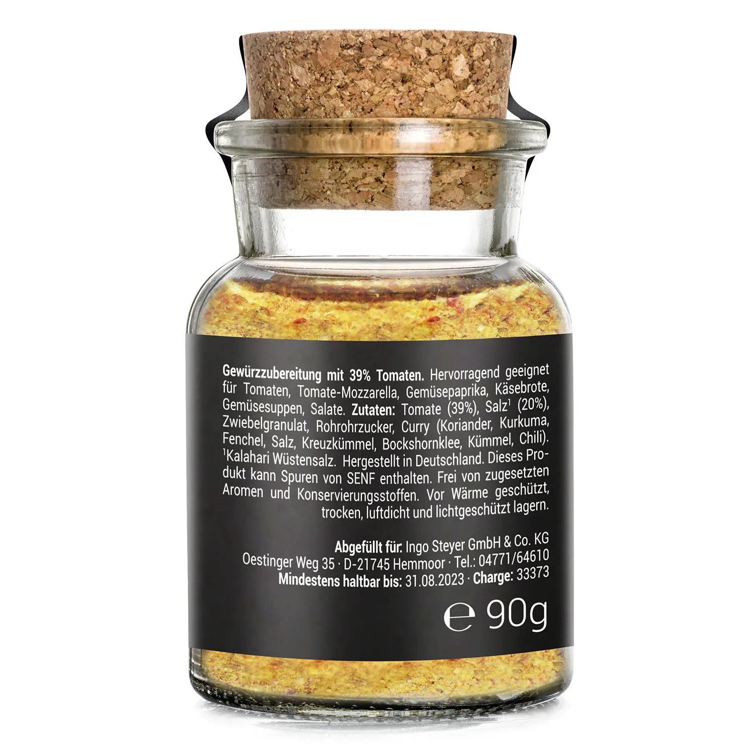 - Zutaten: Tomate (39%), Salz, Zwiebelgranulat, Rohrohrzucker, Curry (Koriander, Kurkuma, Fenchel, Salz, Kreuzkümmel, Bockshornklee, Kümmel, Chili), Kalahari Wüstensalz