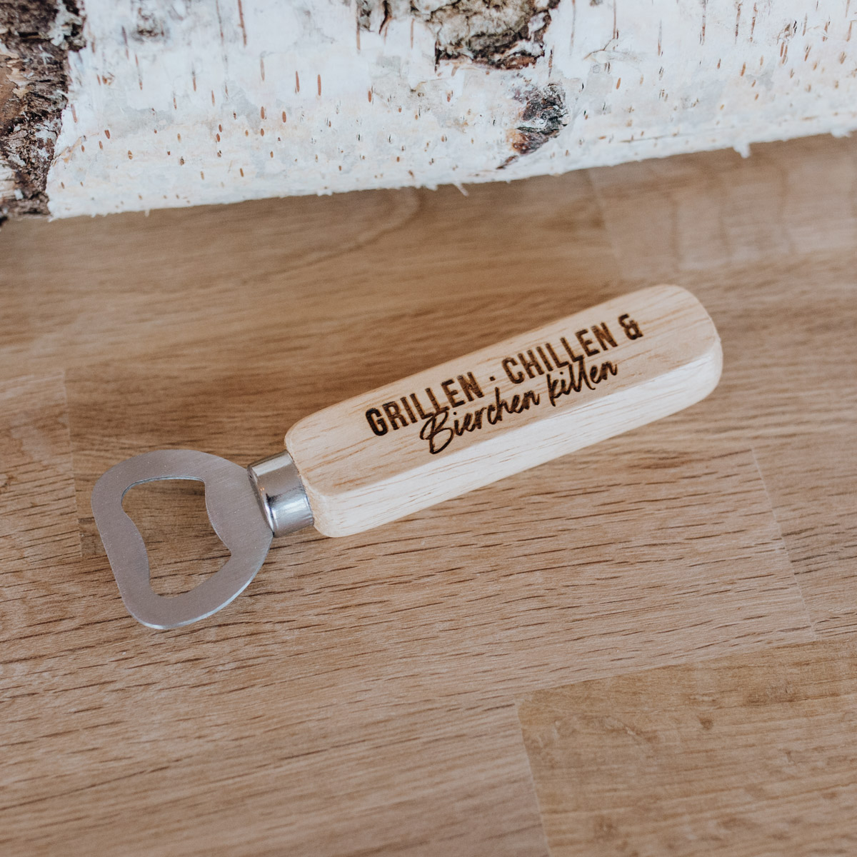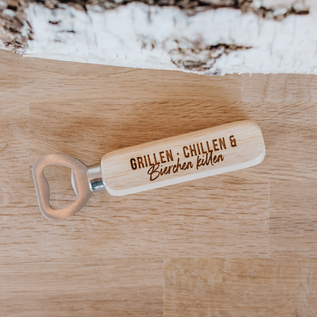 Flaschenöffner | Gravur “Grillen Chillen & Bierchen killen”| 140 x 40 x 17 mm | Holz