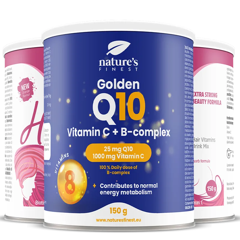 Golden Q10 mit der unbesiegbaren Kraft von Coenzym Q10, Vitamin C und B Vitaminen beugt Hautschäden und Hautalterung vor.