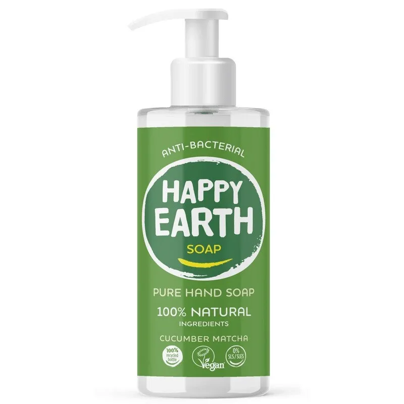 Die Handseife Gurke- Matcha ist eine 100% natürliche Handseife, die aus Inhaltsstoffen hergestellt wird, die Deine Haut und die Erde glücklich machen. Wenn du etwas auf deine Haut aufträgst und es dann in den Abfluss spülst, ist es schön zu wissen, dass es keine verunreinigenden und unangenehmen Inhaltsstoffe wie SLS/SLES, Parabene, Farbstoffe oder andere unangenehme Zusatzstoffe enthält. Außerdem bestehen die Handseifenflaschen zu 100 % aus recyceltem Kunststoff. Happy Earth sind stolz darauf, die Labels NATRUE und Vegan Society zu tragen.