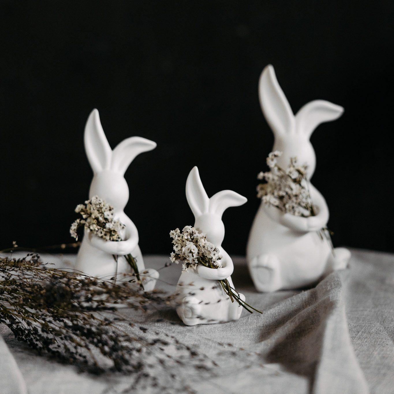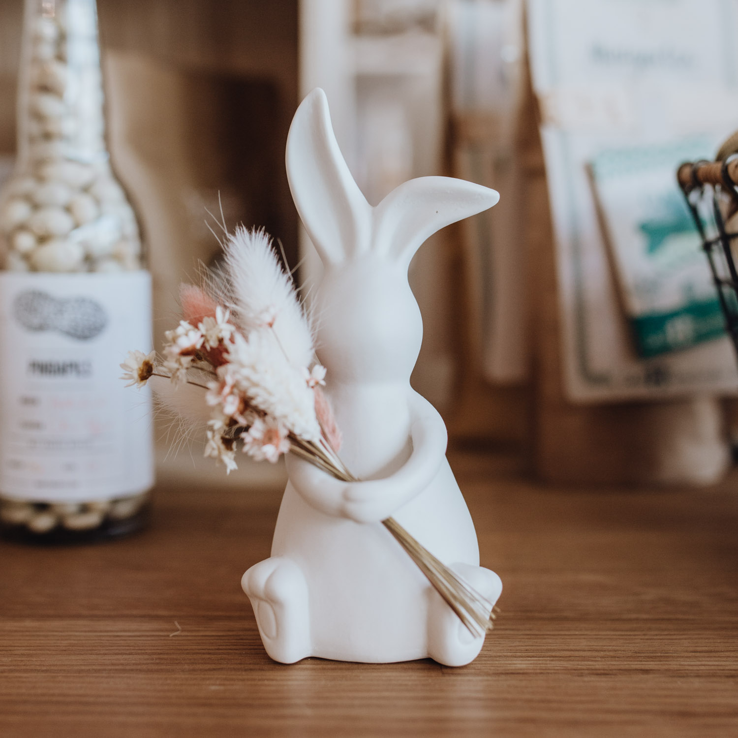 Ein dekorativer Hase aus weißer Keramik, welcher mit einem kleinen Trockenblumensträußchen dekoriert ist. Perfekt als Dekoration für den Frühling oder zu Ostern!
