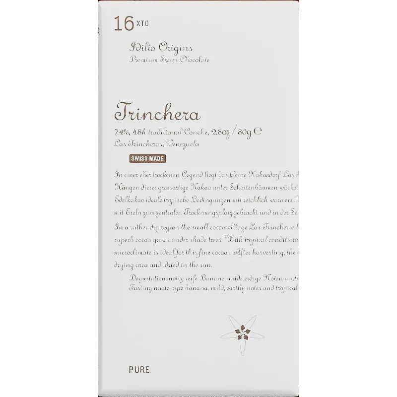 Das kleine Kakaodorf Las Trincheras liegt in einem steilen Tal, an dessen Hängen dieser großartige Kakao unter Schattenbäumen wächst. Das enge Tal hat sein eigenes Mikroklima, das für den Anbau hochwertiger Kakaobohnen ideale tropische Bedingungen mit reichlich warmem Regen bietet. Die Fermentation und Trocknung der Kakaobohnen erfogt fachmännisch und unter Aufsicht. Die Röstung und Weiterverarbeitung erfolgt – wie bei allen Idilio-Schokoladen – durch die Schweizer Traditionsfirma Felchlin in Schwyz. Dort wird die Kakaomasse 48 Stunden im traditionellen Längsreiber conchiert.