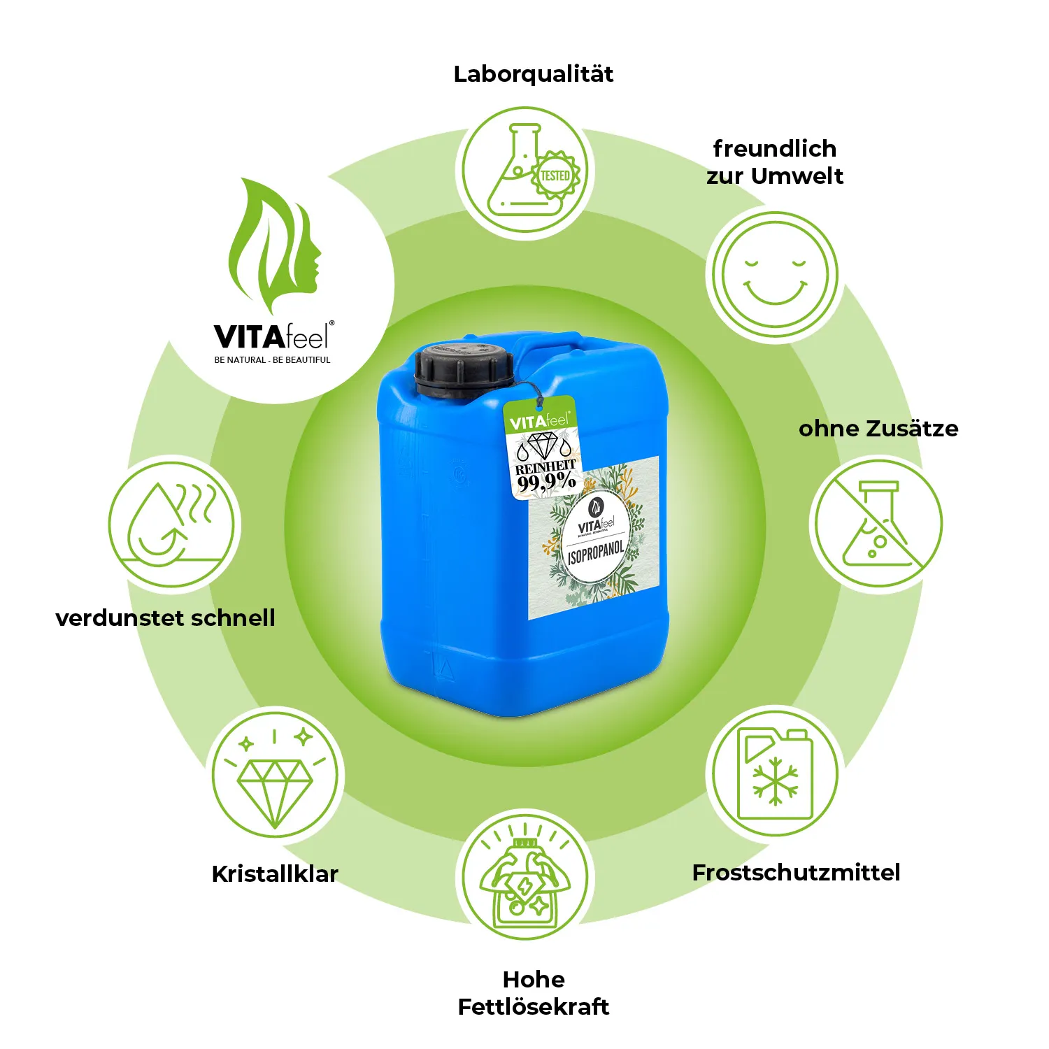 Isopropylalkohol von VitaFeel bietet eine vielseitige Anwendung, wie z.B. zur Reinigung von verunreinigten Oberflächen in der Lebensmittel-, Kosmetik-, Haushalt- und Industriebranche – Lösungsmittel für Fette, Harze, Lacke, Tinte usw.