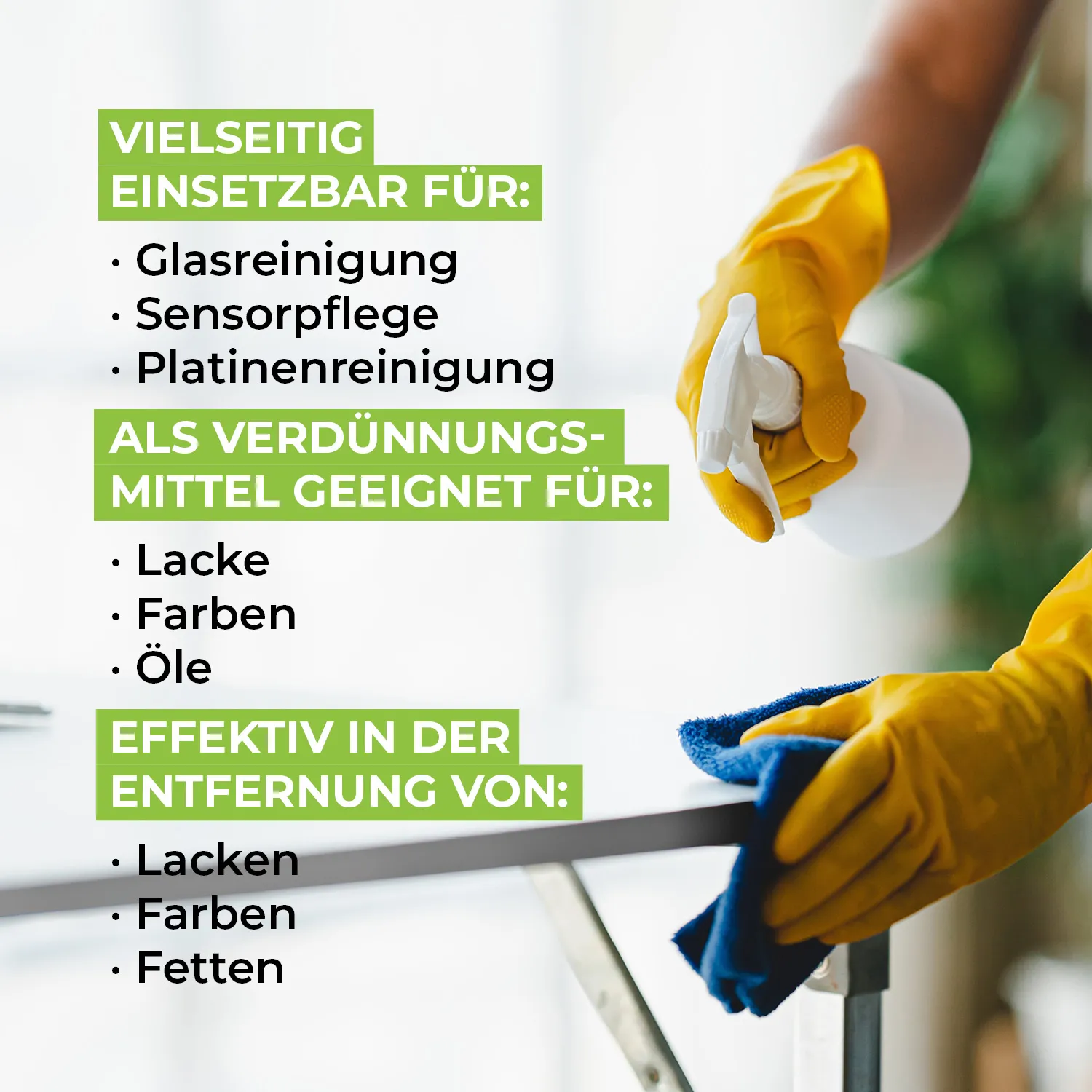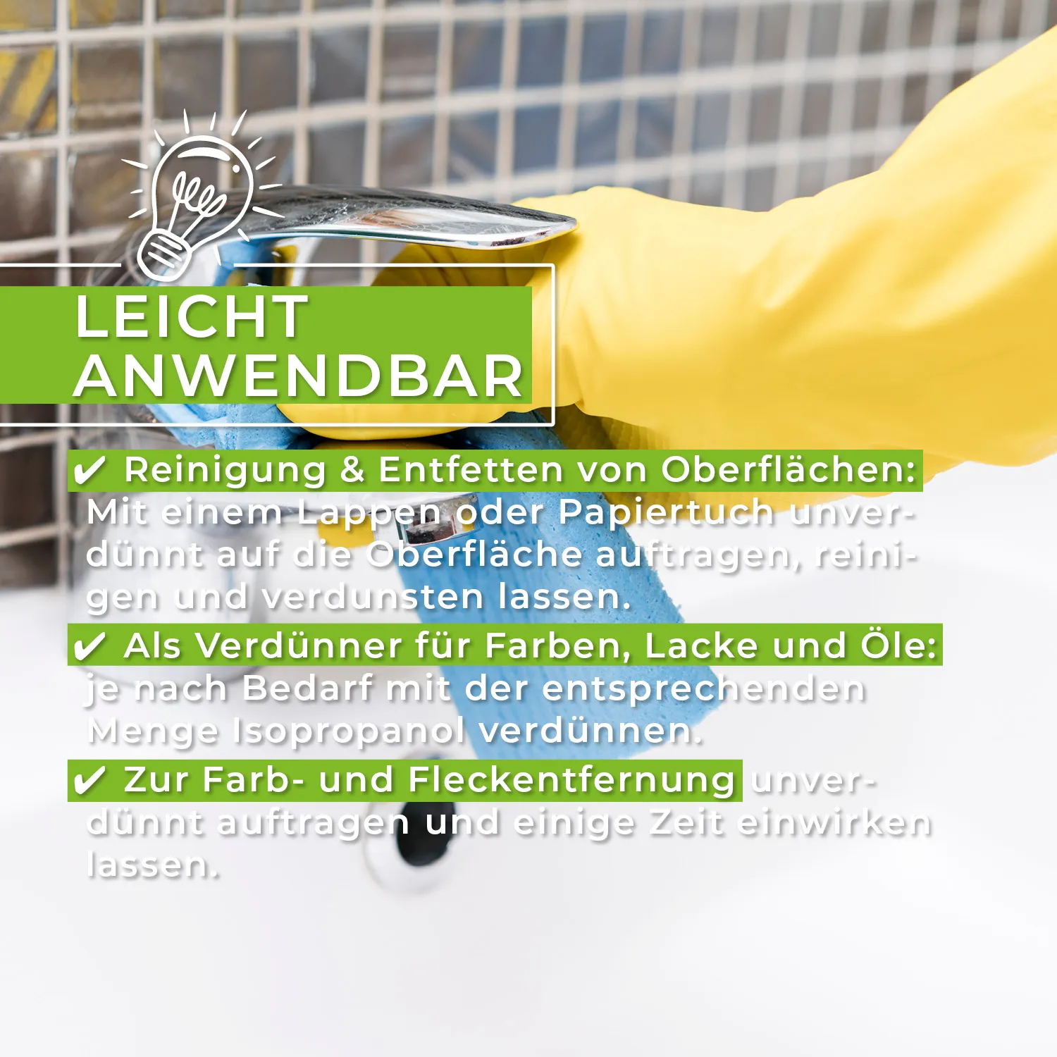 Aufgrund der guten Fettlösekraft wird Isopropanol gerne in Industrie sowie im Haushalt als Reinigungsmittel genutzt.