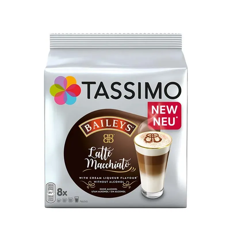 Mit diesem Produkt ist es nicht länger notwendig, eine Baileys-Flasche zuhause stehen zu haben, um einen Latte Macchiato mit Baileys genießen zu können. TASSIMO Typ Latte Macchiato Baileys enthält keinen Alkohol.