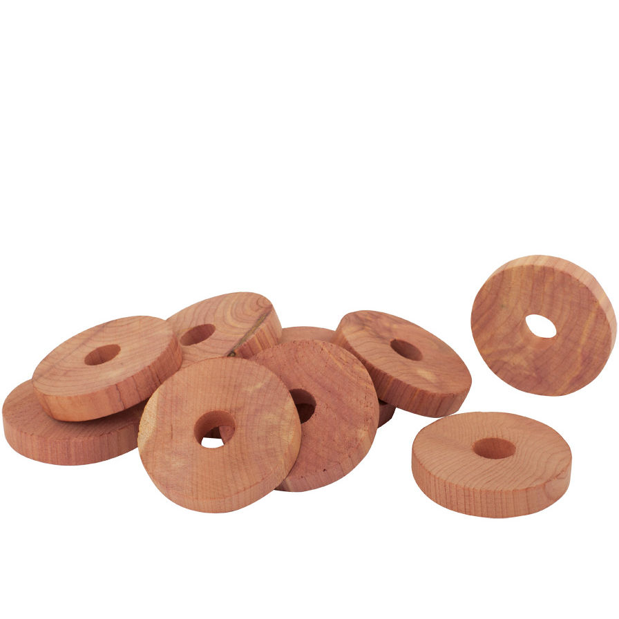 Rot-Ceder Kleiderbügelscheiben. Hergestellt aus der amerikanischen Rot-Zeder (Juniperus Virginia) für den umweltfreundlichen Mottenschutz. Hält Motten von Schränken, Kommoden und Schubladen fern. Hergestellt vom Bürstenhaus Redecker.