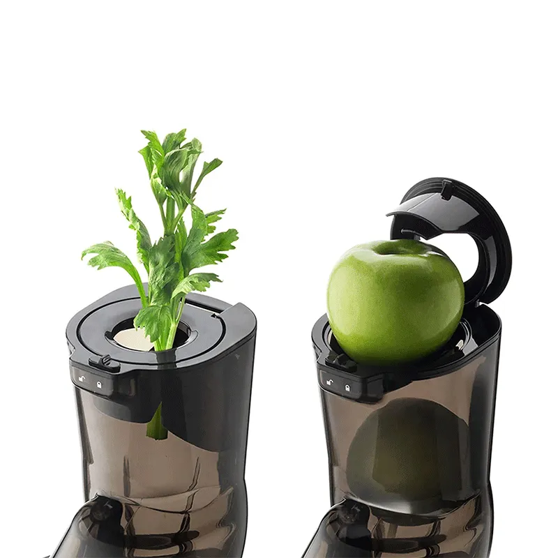 Der Einfülltrichter des Kuvings Evolution EVO820 ist mit einem Durchmesser von 82 mm besonders groß und flexibel. Er nimmt auch sehr grobes Pressgut auf und spart Ihnen somit Zeit. Anders als bei vergleichbaren Entsaftern muss das Obst oder Gemüse nicht erst in kleine Stücke geschnitten werden. Selbst kleine Äpfel passen im Ganzen in den Schacht!