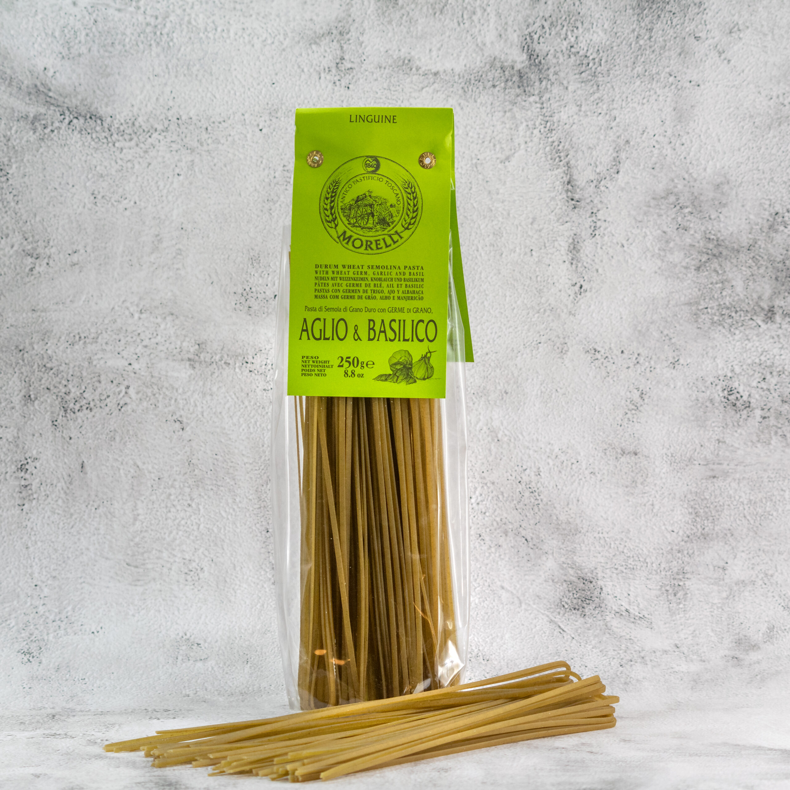 Salz: 0,06 g“]Nährwerte pro 100g:[/vc_custom_heading][vc_single_image media=“86366″ media_width_percent=“100″][/vc_column_inner][vc_column_inner column_width_percent=“100″ gutter_size=“3″ overlay_alpha=“100″ shift_x=“0″ shift_y=“0″ z_index=“0″ medium_width=“2″ align_mobile=“align_center_mobile“ mobile_width=“0″ zoom_width=“0″ zoom_height=“0″ width=“1/4″][vc_custom_heading heading_semantic=“h3″ text_size=“h4″ sub_reduced=“yes“ subheading=“Um das Beste aus diesen Nudeln herauszuholen, empfehlen wir Ihnen, unsere leckeren Sugos, Bruschettas und Pestos zu verwenden. Unsere Sugos werden nach traditionellen Rezepten hergestellt und enthalten nur die besten Zutaten. Ob mit frischen Tomaten und Basilikum oder mit mediterranen Kräutern verfeinert – sie geben den Linguine Knoblauch & Basilikum eine besondere Geschmacksnote und machen jedes Gericht zu einem wahren Genusserlebnis.“ uncode_shortcode_id=“112649″]Beschreibung: