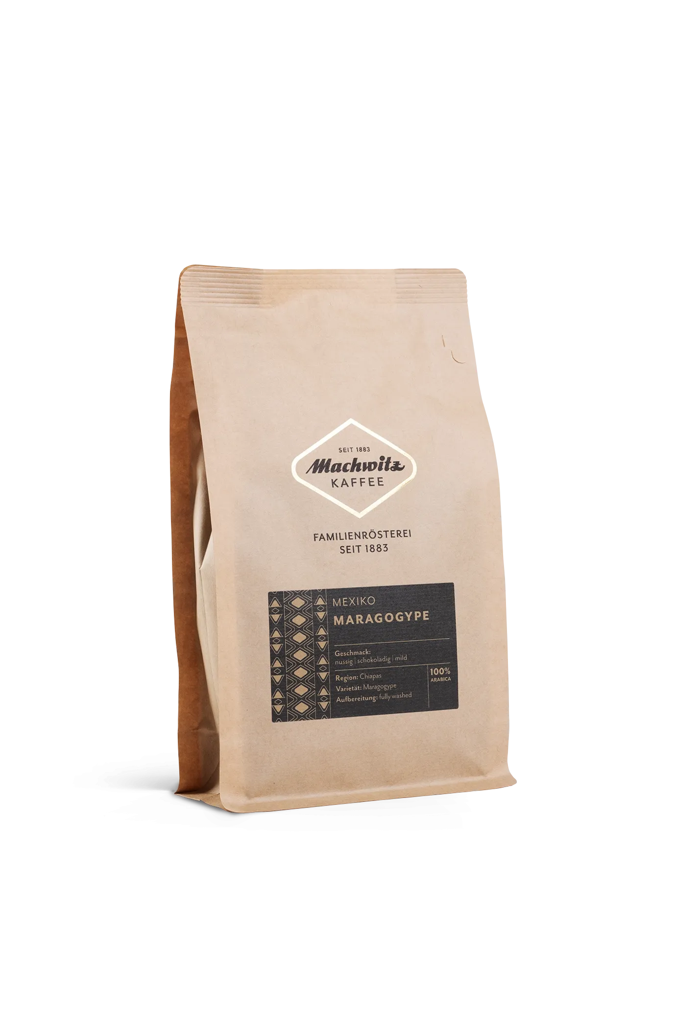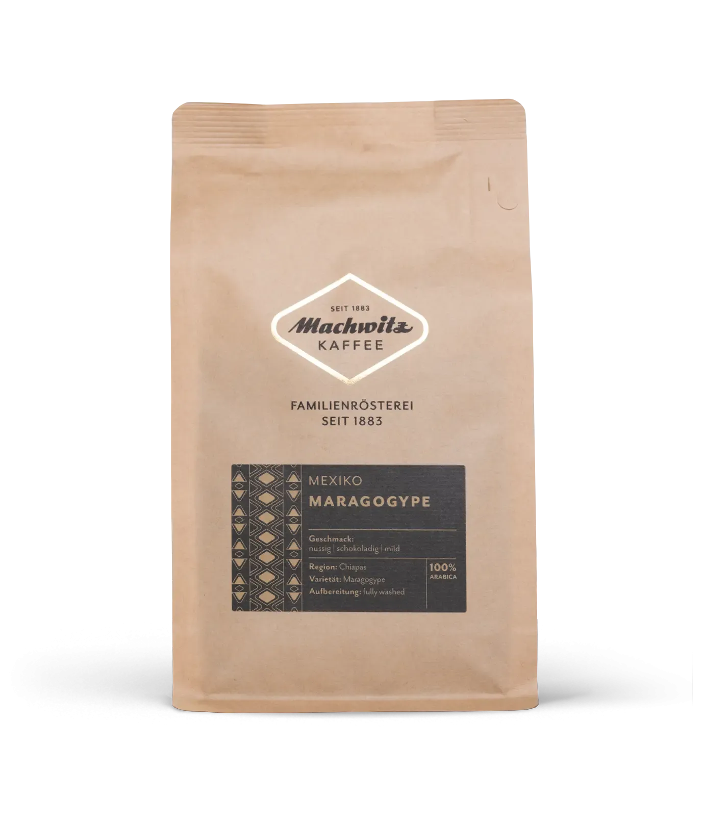 Die Maragogype Bohne ist eine Kreuzung aus Arabica und Liberica und wird auch häufig Elefanten- oder Riesenbohne genannt. Heute wird diese besondere Sorte vorwiegend in Mexico und Nicaragua angebaut. Unser sortenreiner Plantagenkaffee kommt aus der Region Chiapas im Süden von Mexico und ist ein naturmilder Kaffee mit vollem Aroma