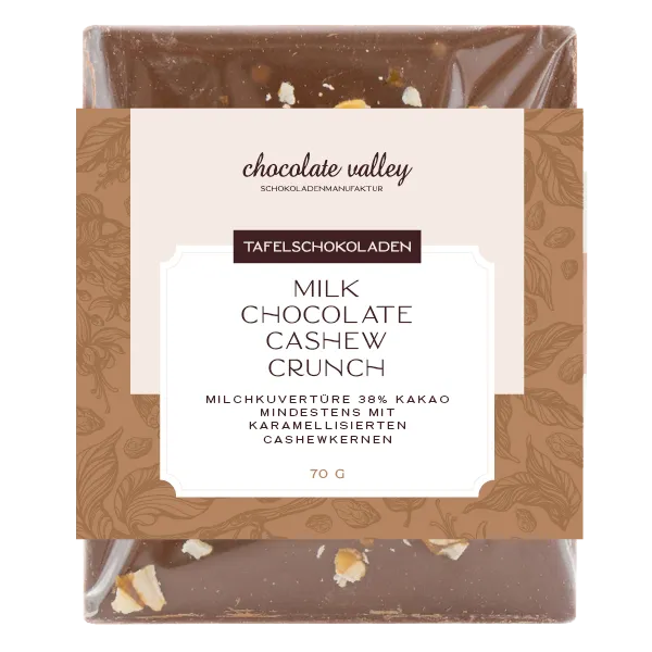 Milchkuvertüre 38% Kakao mit karamellisierten Cashewnüssen.