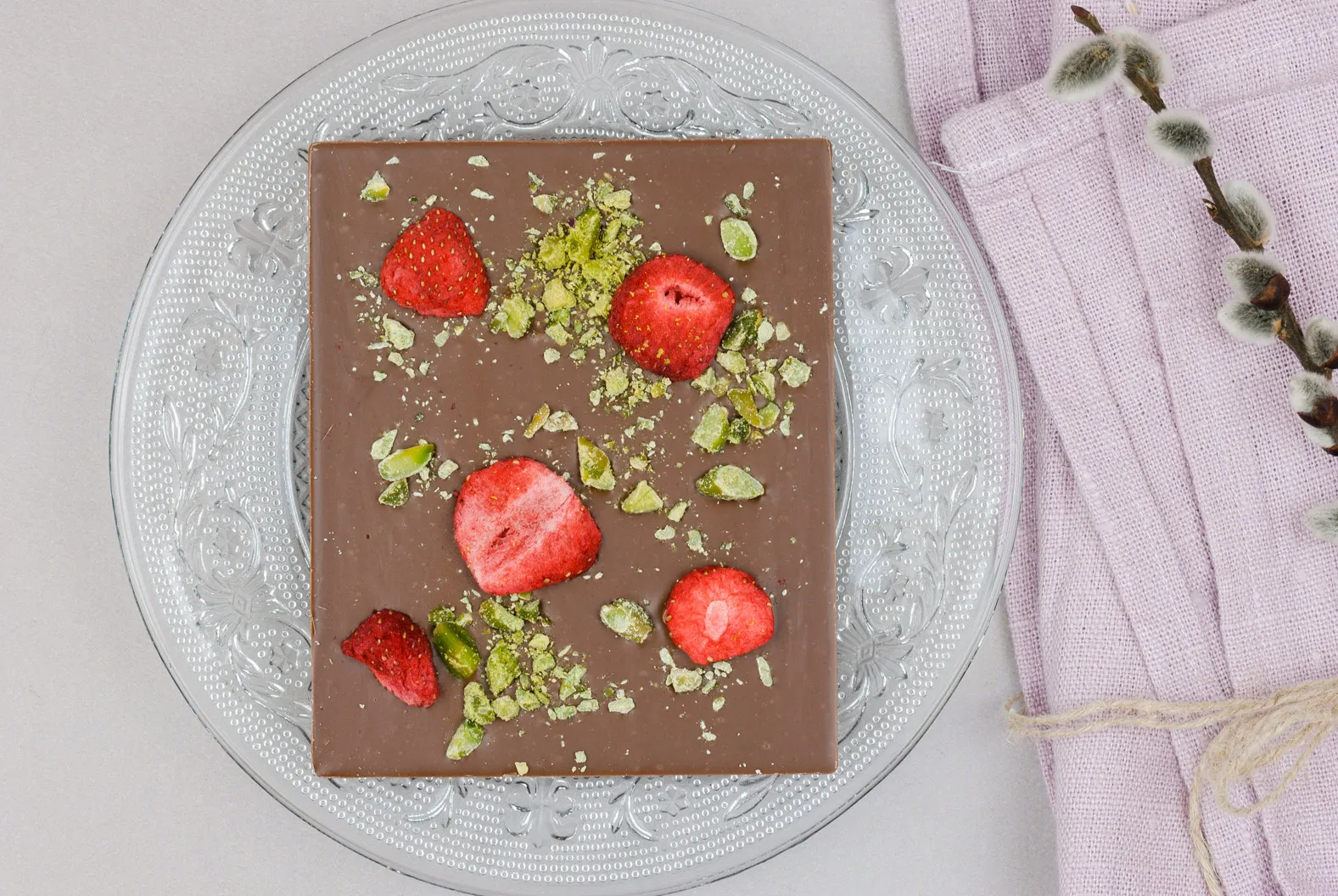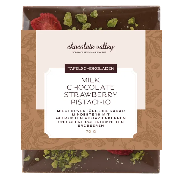 Milchkuvertüre 38% Kakao mit Pistazien aus dem Iran und gefriergetrockneten Erdbeerscheiben.