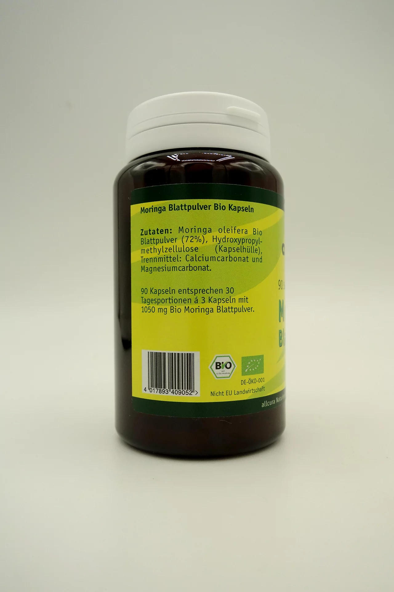 Moringa oleifera Bio Blattpulver, Hydroxypropylmethylzellulose (Kapselhülle), Trennmittel: Calciumcarbonat und Magnesiumcarbonat.